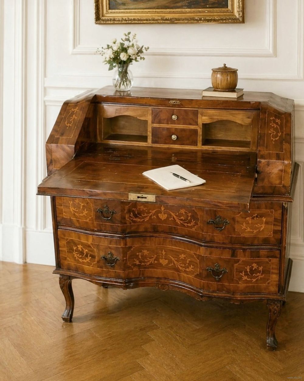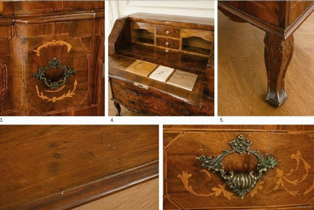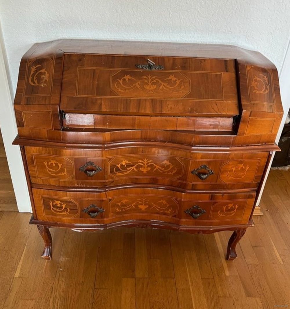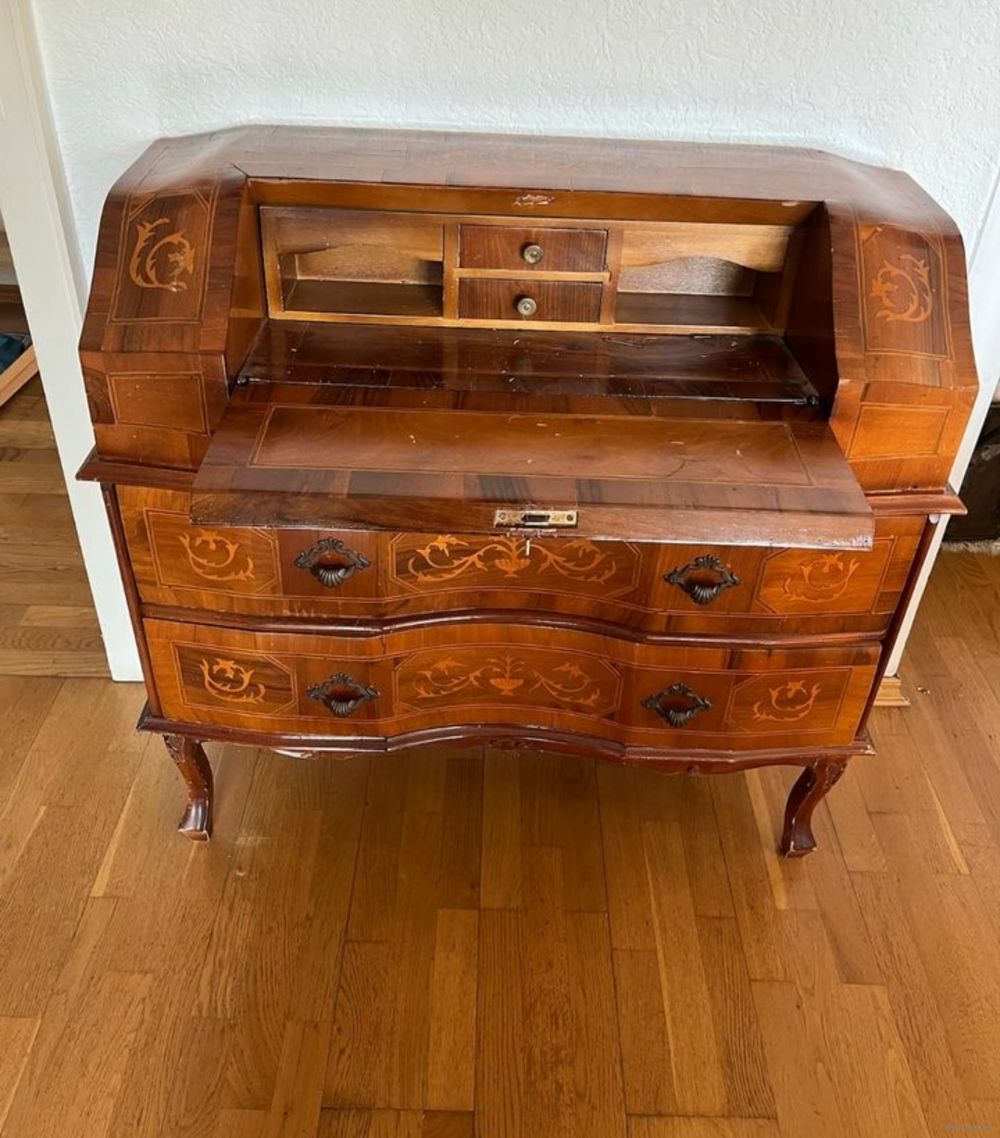 Продаю из собственного дома изысканный антикварный секретер в стиле рококо, ориентировочно начало XX века. Предмет выполнен из натурального дерева с тонкой художественной интарсией и элегантной, плавной пластикой форм.