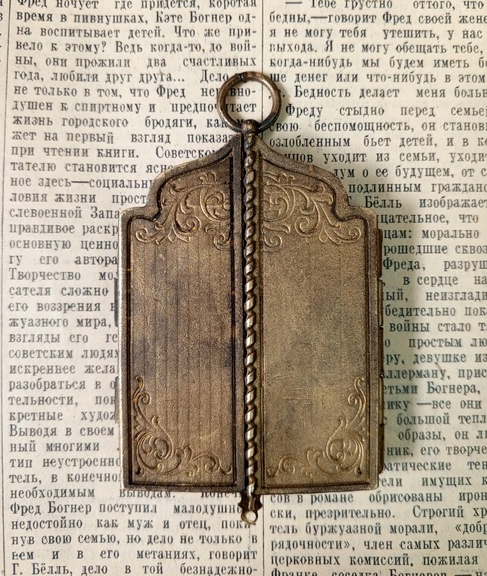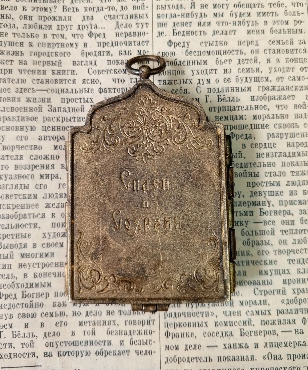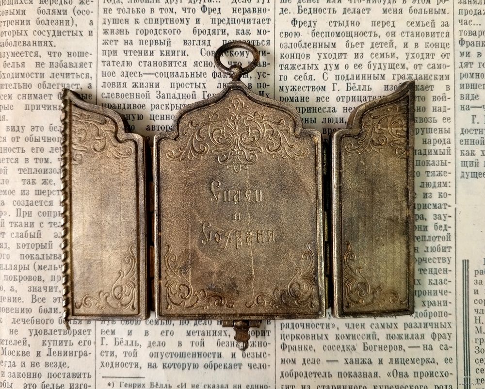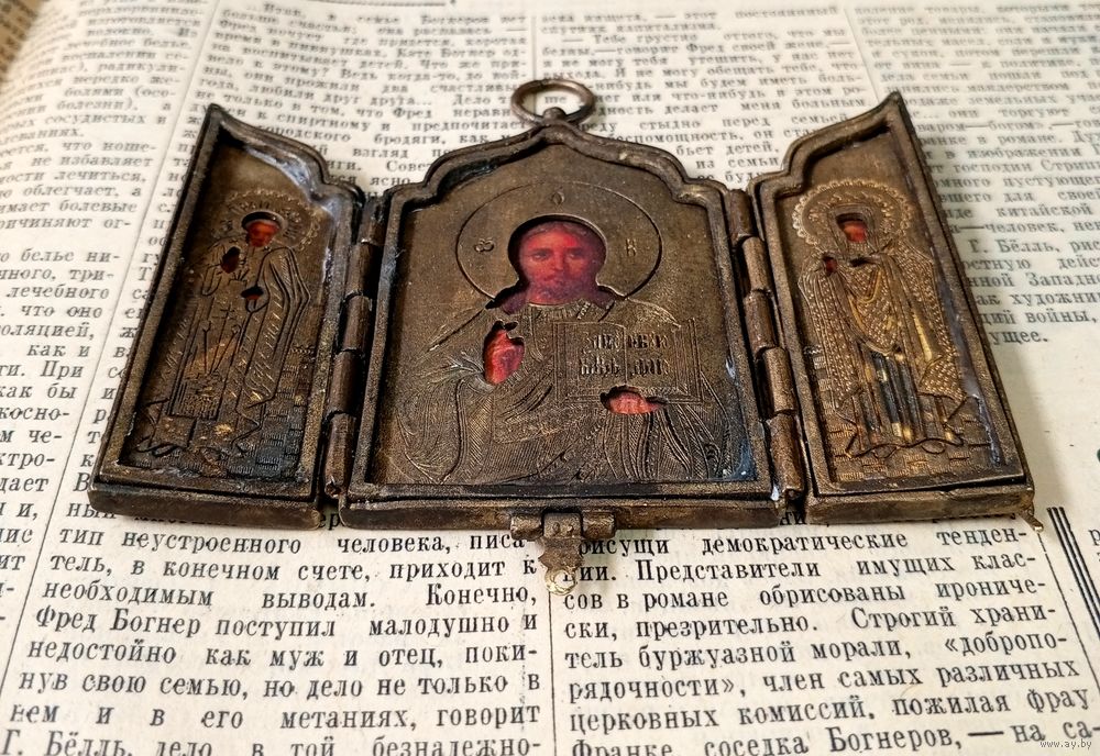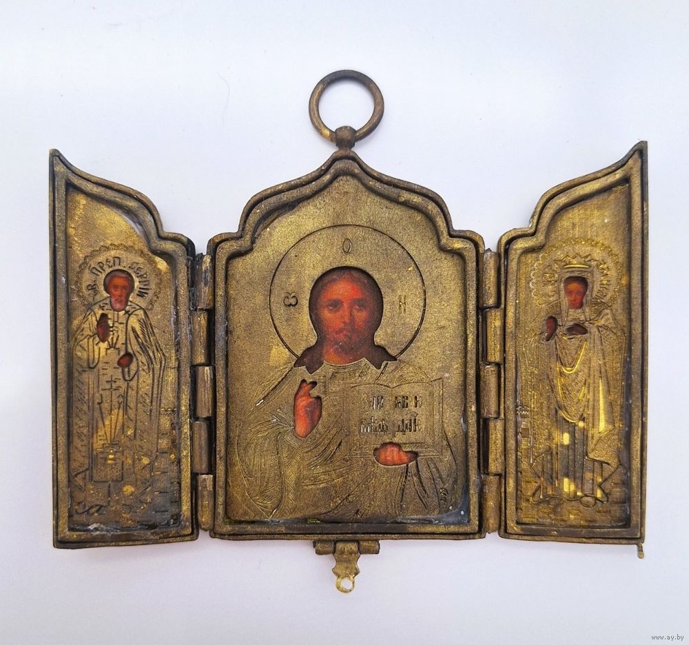 Антикварный трехстворчатый складень (дорожная икона) Господь Вседержитель, Преподобный Сергий Радонежский, Святая мученица царица Александра