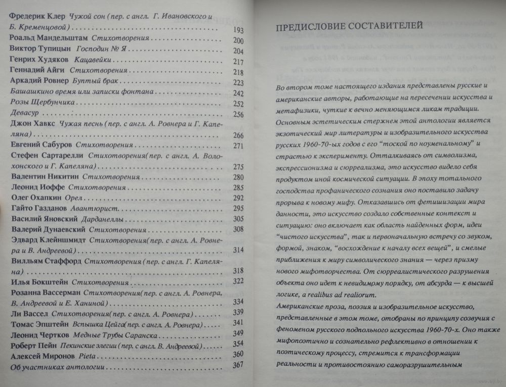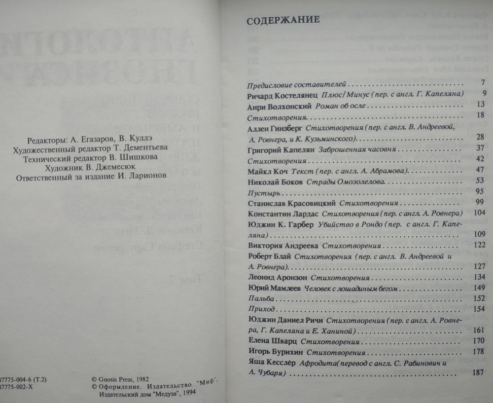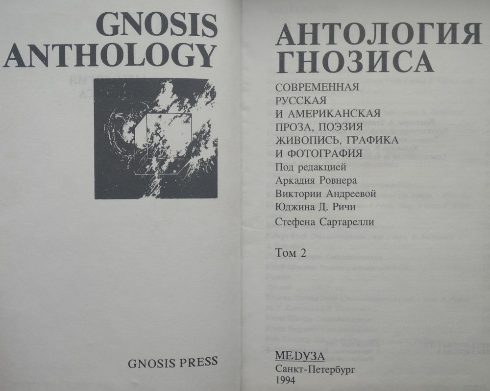 Современная русская и американская проза, поэзия, живопись, графика и фотография. / Под редакцией Аркадия Ровнера, Виктории Андреевой, Юджина Д. Ричи, Стефена Сартарелли. - Санкт-Петербург: "Медуза", 1994. Ихдание представляет уникальный мир русского религиозно-мистического и художественного подполья 1960-1970 годов и его встрече метафизическими и художественными реалиями Запада того же периода.