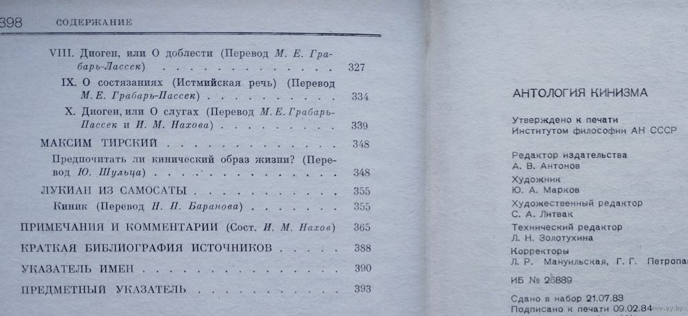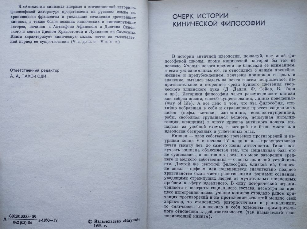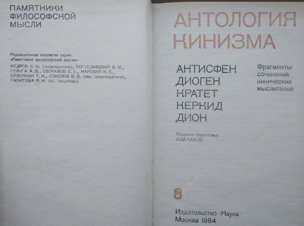 448 стр. Впервые в отечественной историко-философской литературе представлены на русском языке сохранившиеся фрагменты и уцелевшие сочинения древнейших киников, а также более поздних кинических и кинизирующих авторов, начиная с Антисфена Афинского и Диогена Синопского и кончая Дионом Хрисостомом и Лукианом из Самосаты. Книга характеризует киническую мысль почти за тысячелетний период ее существования (V в. до н. э. - V в. н. э.).