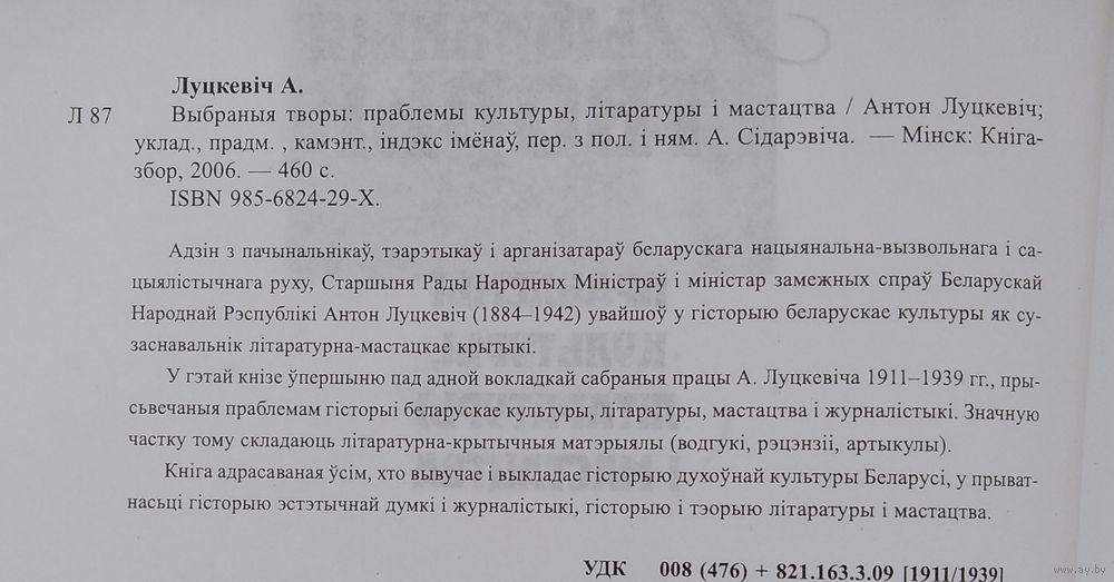 Антон Луцкевіч. Выбраныя творы: праблемы культуры, літаратуры і мастацтва. Мінск : Кнігазбор, 2006 г. 459 с. Цверды пераплет. Пабольш. фармат.