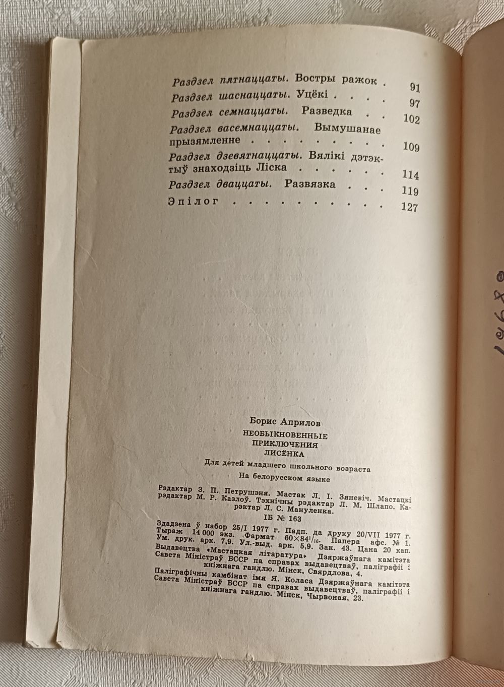 Апрылаў Барыс. Незвычайныя прыгоды ліска. Аповесць. Мінск, Мастацкая літаратура, 1977, стр. 136.