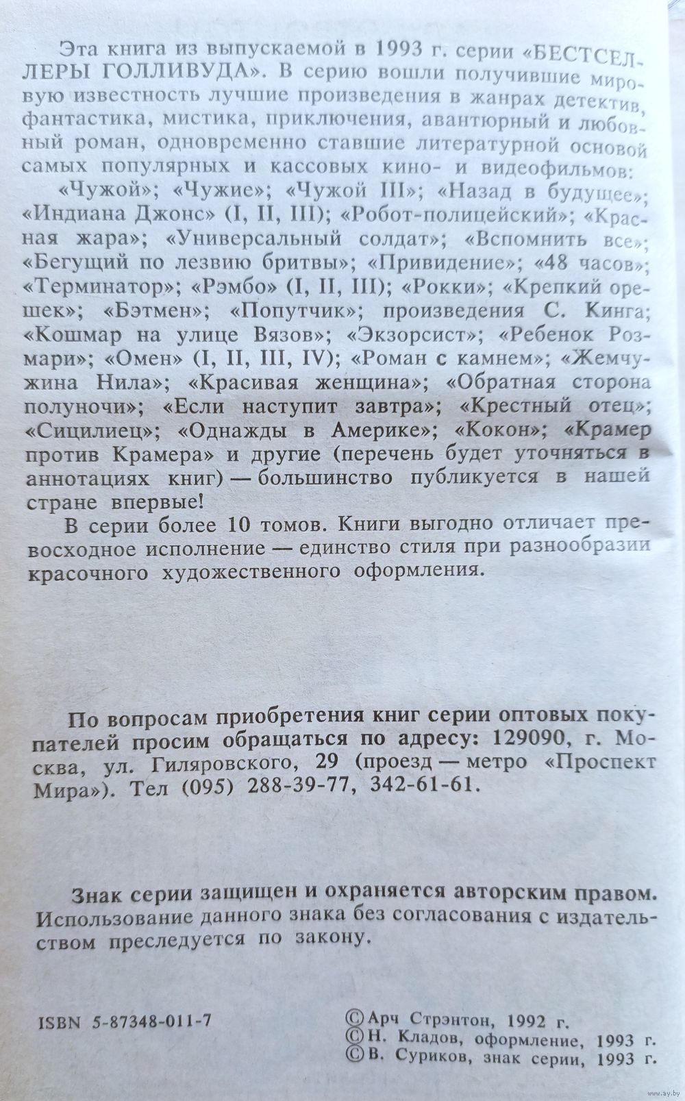 Арч Стрэнтон. Универсальный солдат. Чужой III | Твердый переплет, 464 стр., отличное состояние непрочитанной книги, серия "Бестселлеры Голливуда", 1993 год, "Геолит"