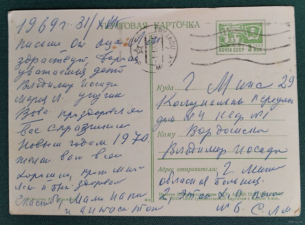 Арцименев Ю. С Новым годом! 1969 г. ПК. Прошла почту.