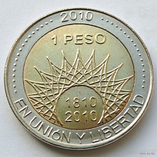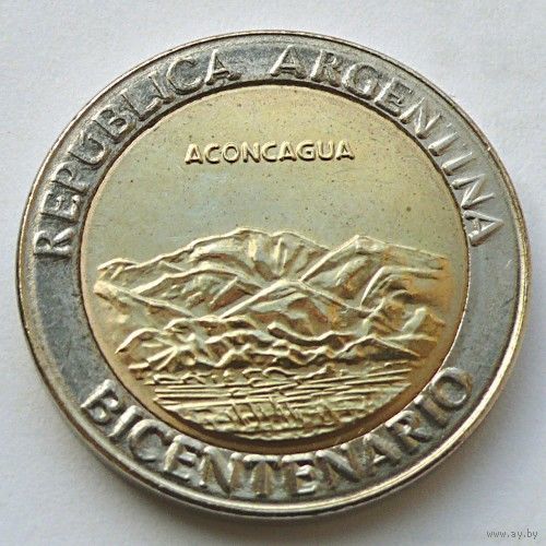 Аргентина 1 песо, 2010 года, UNC. "200 лет Аргентине - вулкан Аконкагуа". Предложите свою цену или обмен!