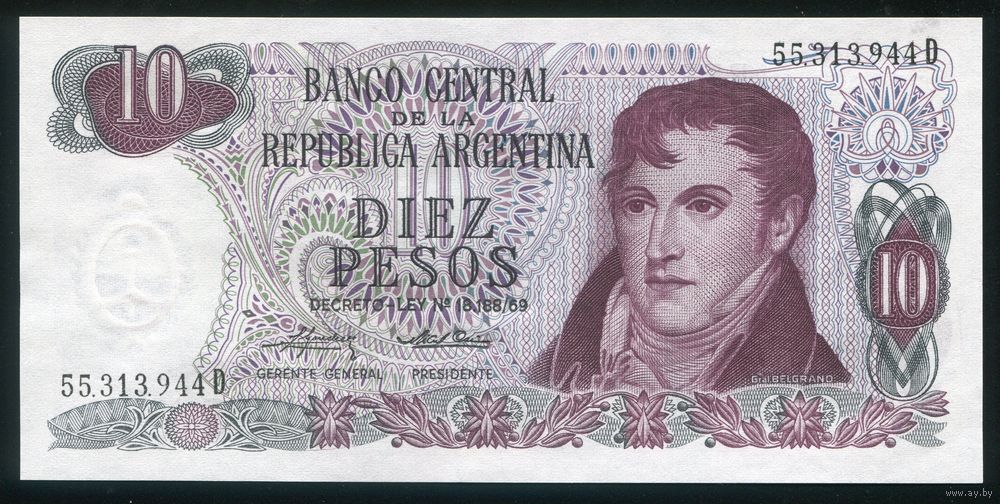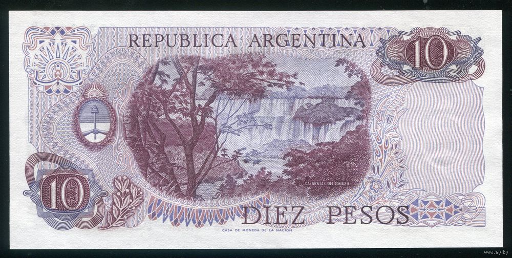 Аргентина 10 песо 1973-1976 гг. P295(3). Серия D. UNC