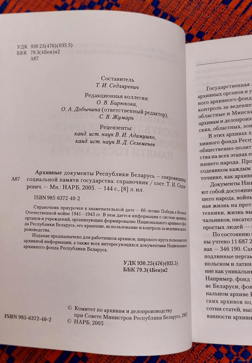 Архивные документы Республики Беларусь -- сокровищница социальной памяти государства. справочник