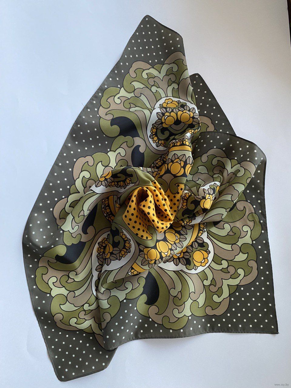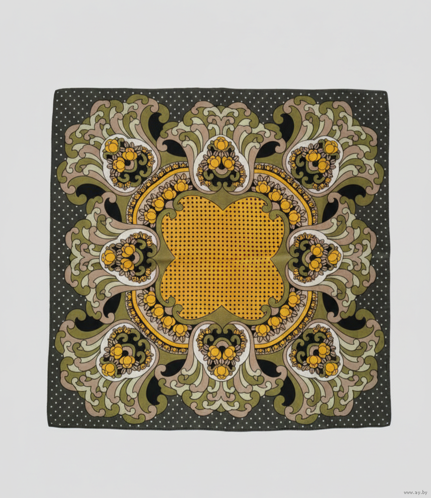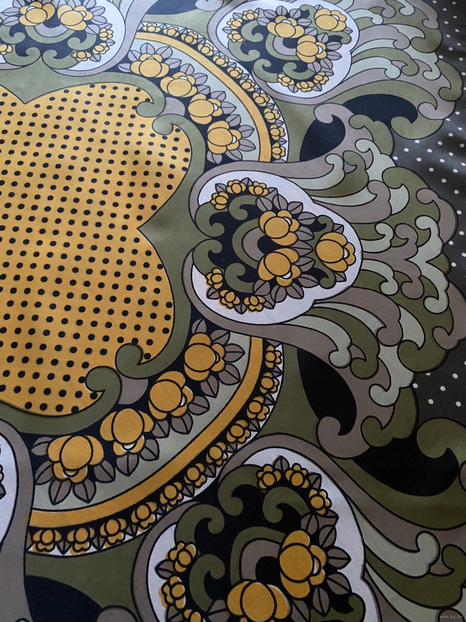 Винтажный платок 80-х годов с барочным узором в оттенках мха и горчицы.