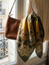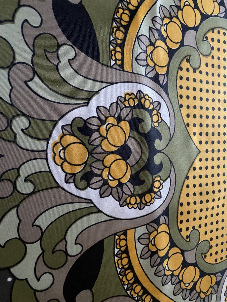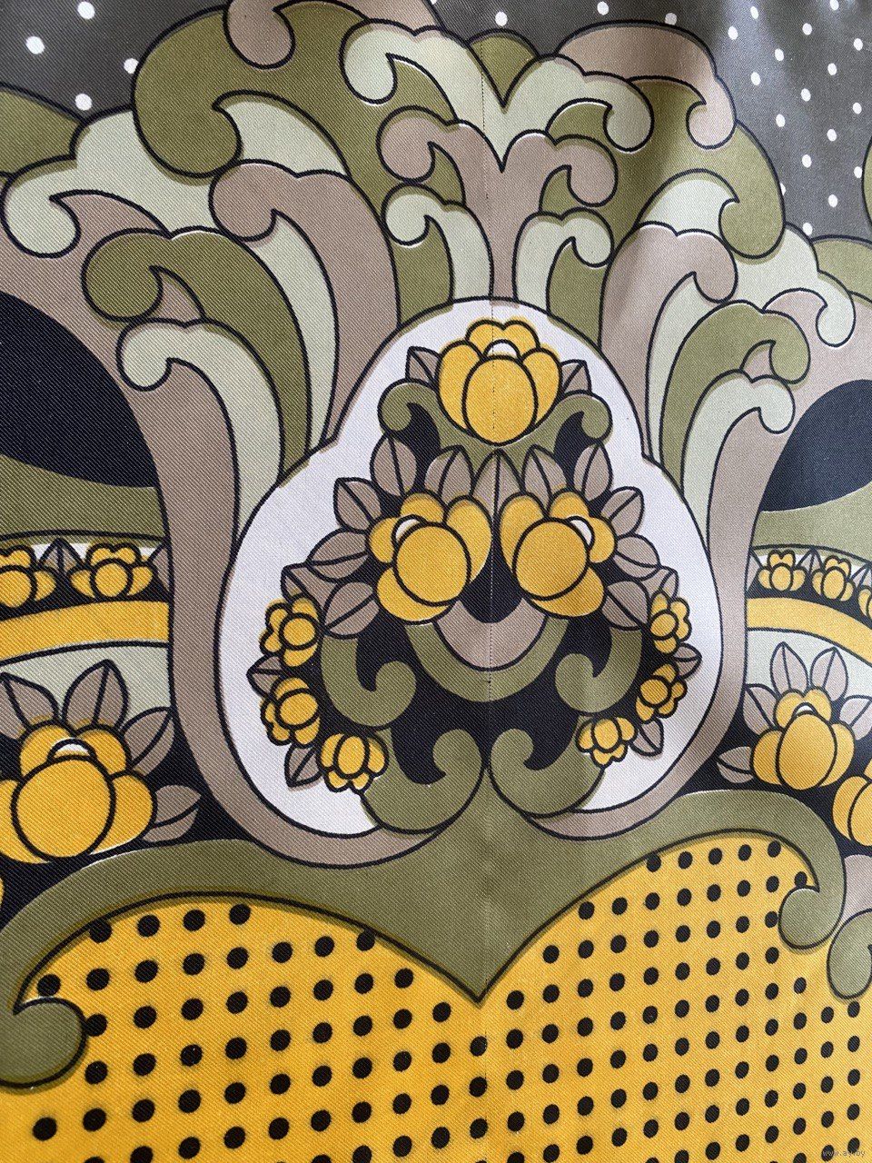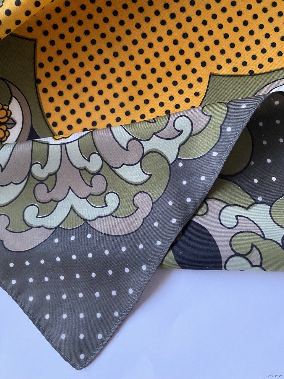 Винтажный платок 80-х годов с барочным узором в оттенках мха и горчицы.