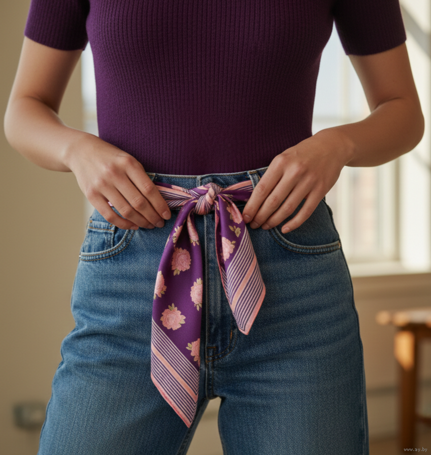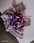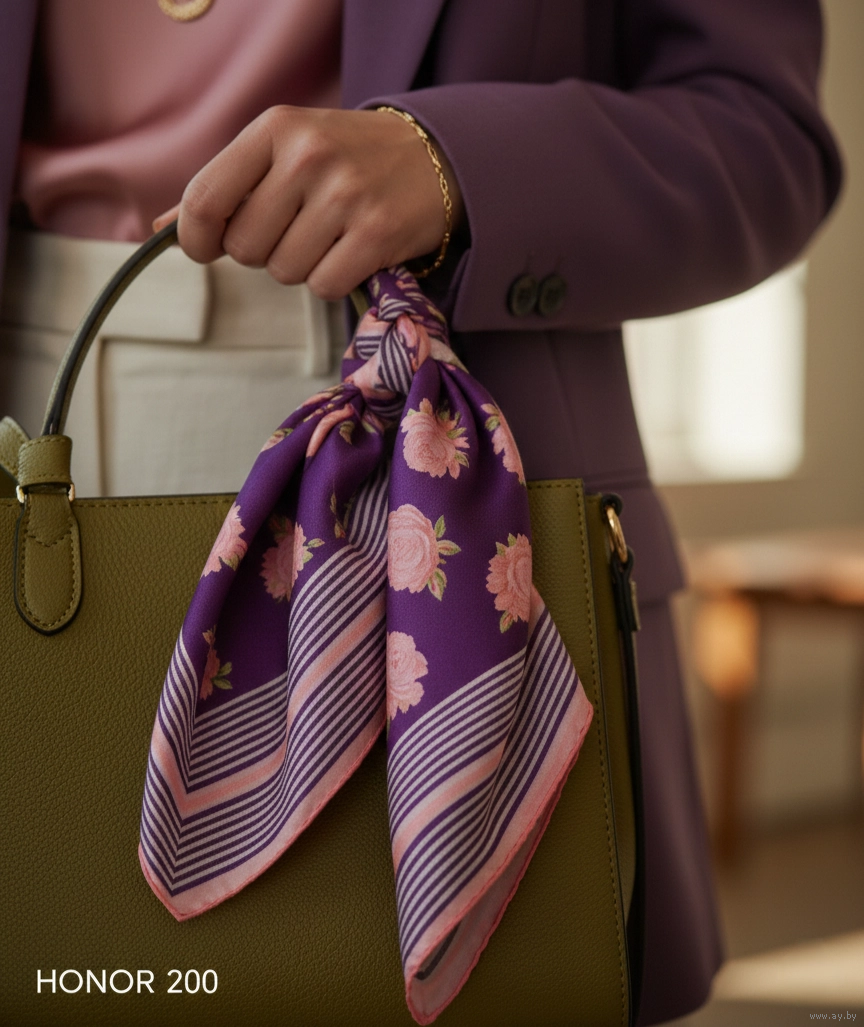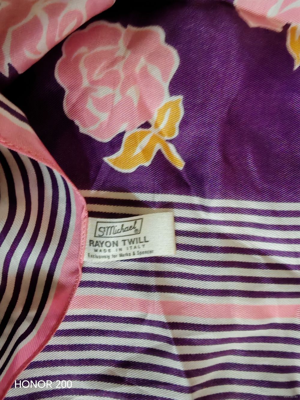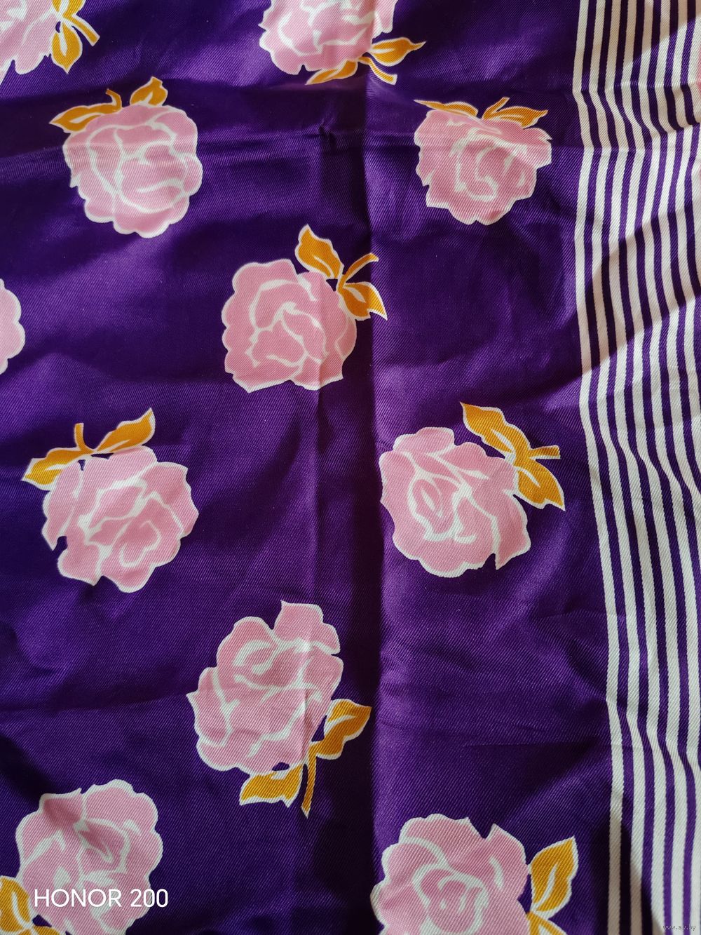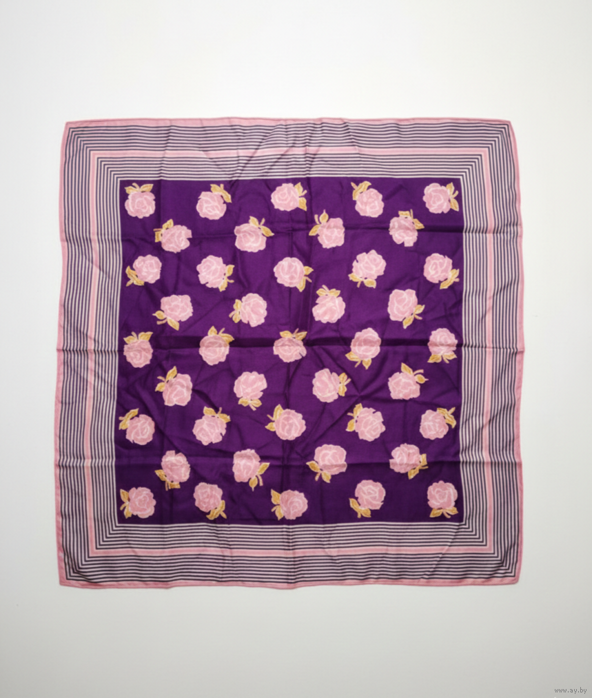 Винтажный платок с принтом "чайная роза" на глубоком фиолетовом фоне. Геометрическая окантовка добавляет строгости, что является характерным почерком люксовых платков прошлого века.
