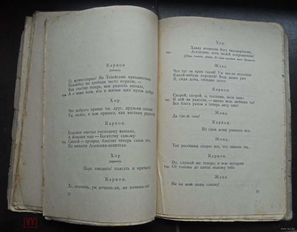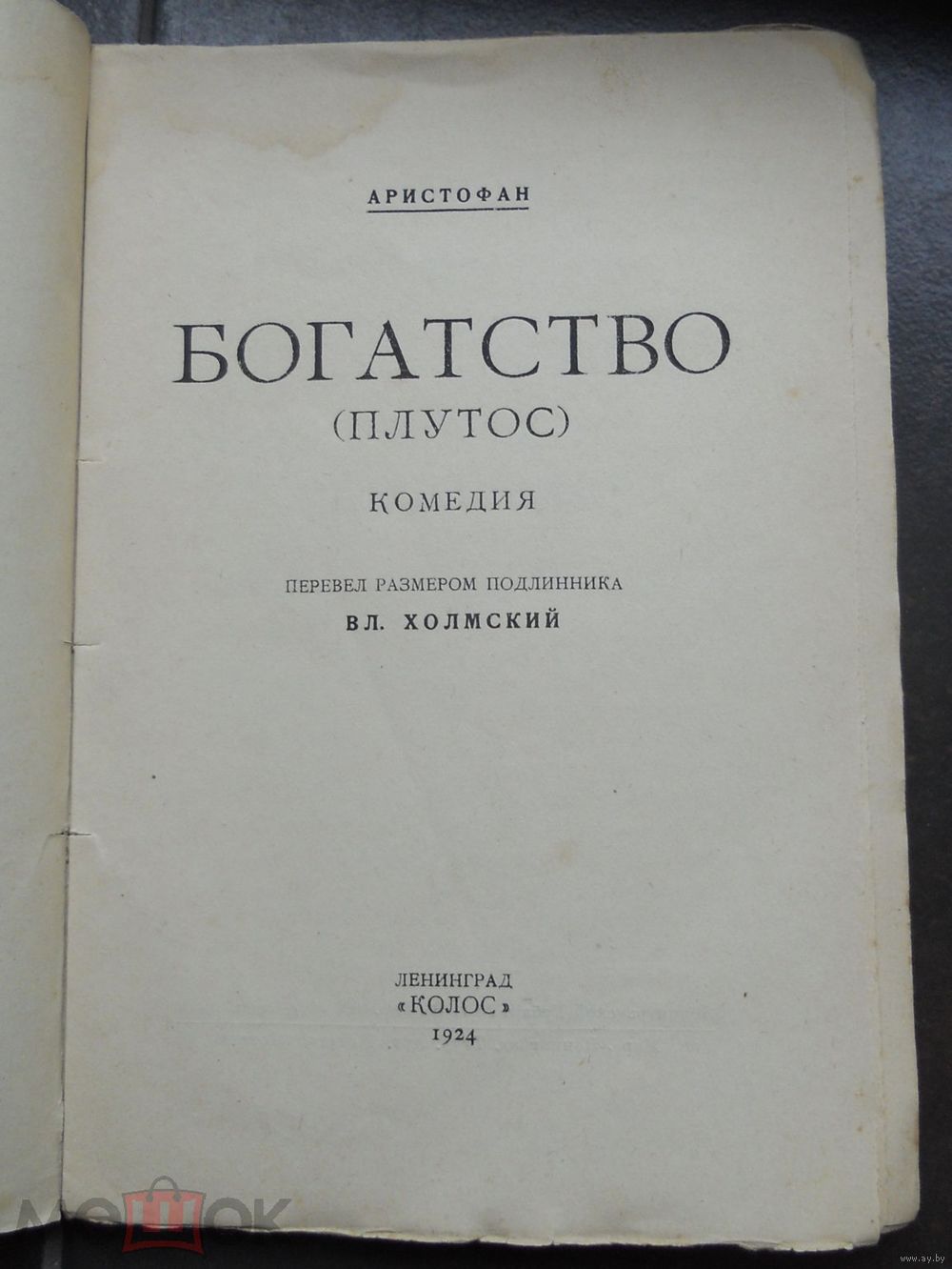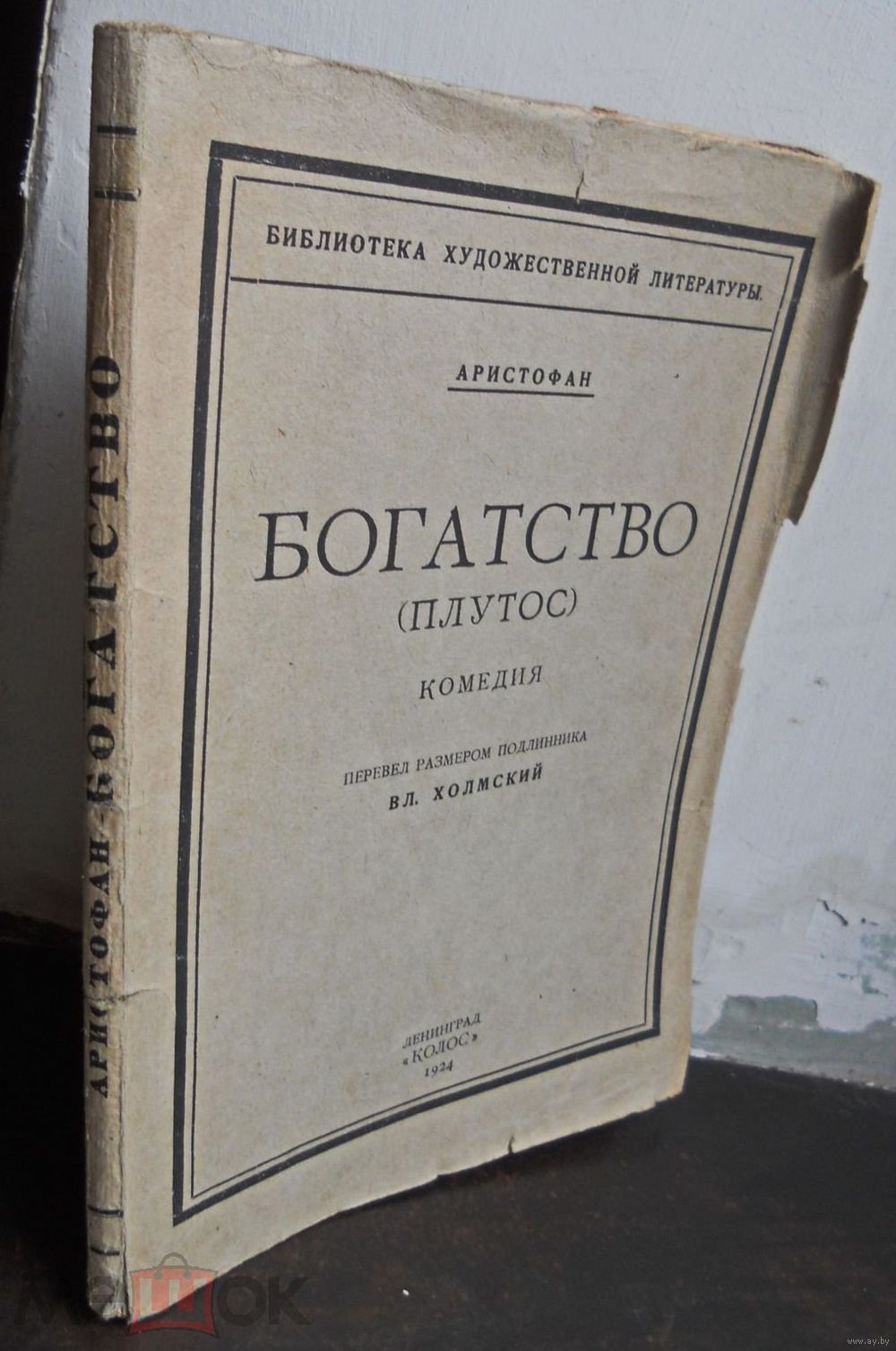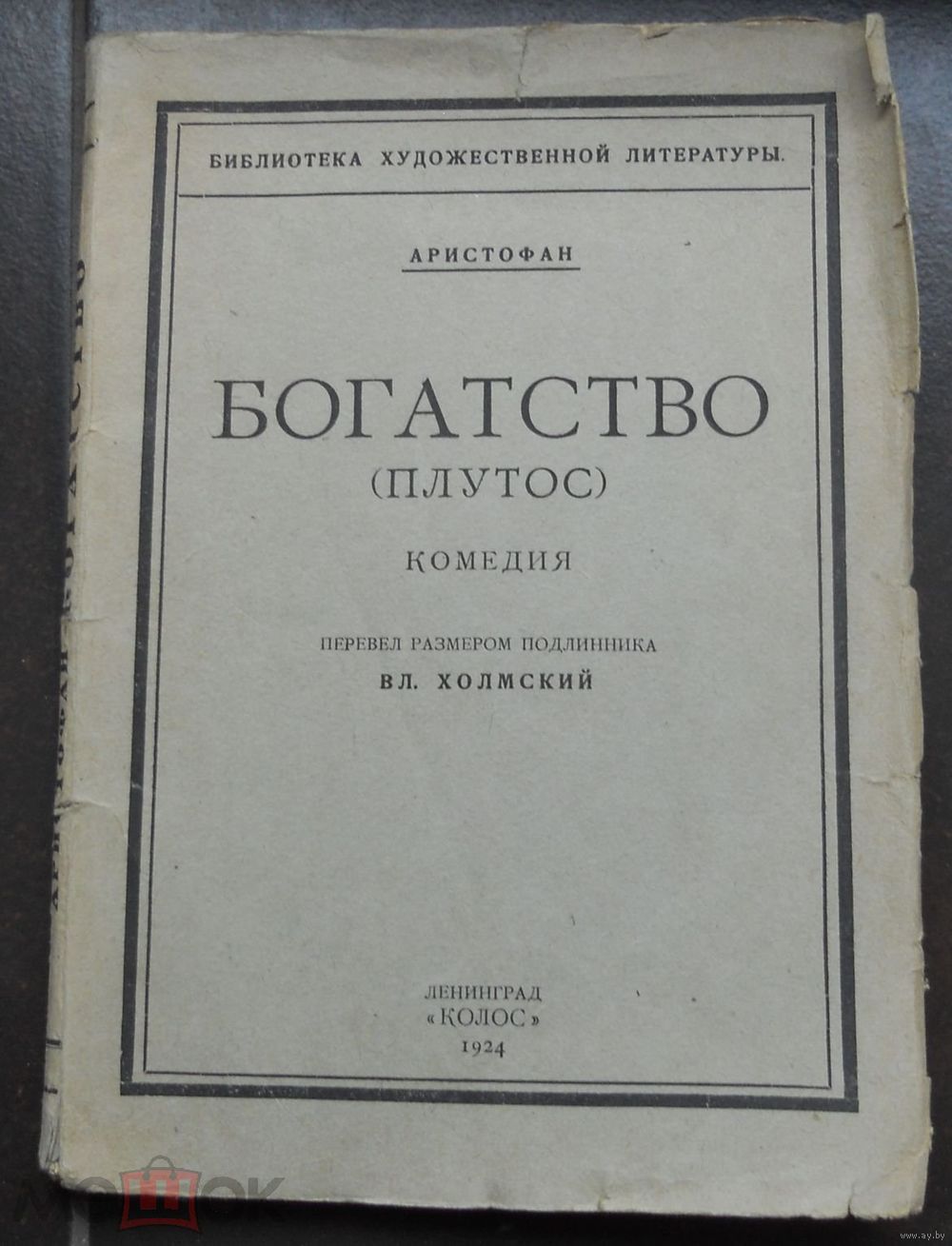Аристофан. Богатство (Плутос). Перевел размером подлинника Холмский Вл. Л. Серия: Библиотека художественной литературы. Л. ``Колос`` 1924г. 120с. Мягкий издатльский переплет. 20,5 на 14,5 см.