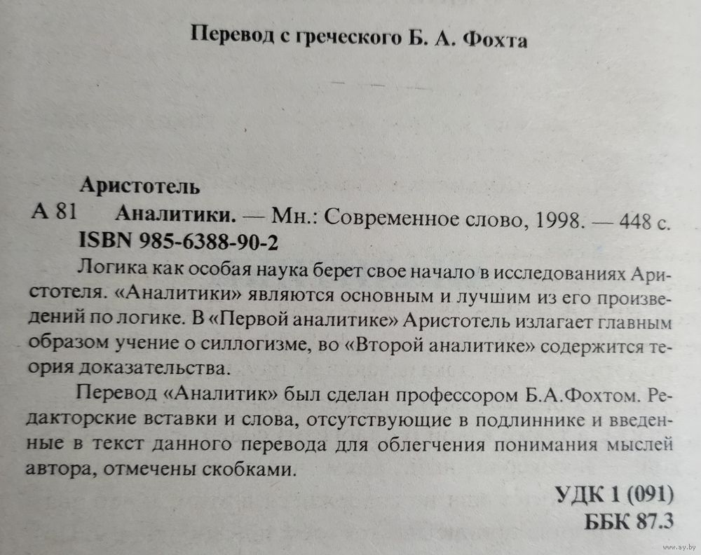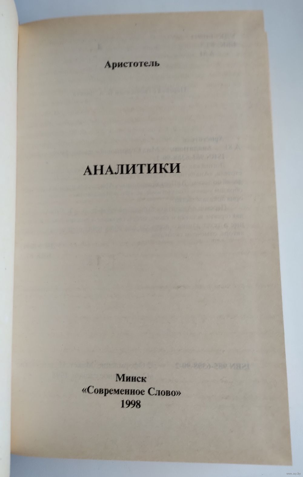 Аристотель. Аналитики. Минск: Современное слово, 1998г., 448 с. Твёрдый переплёт, обычный формат.