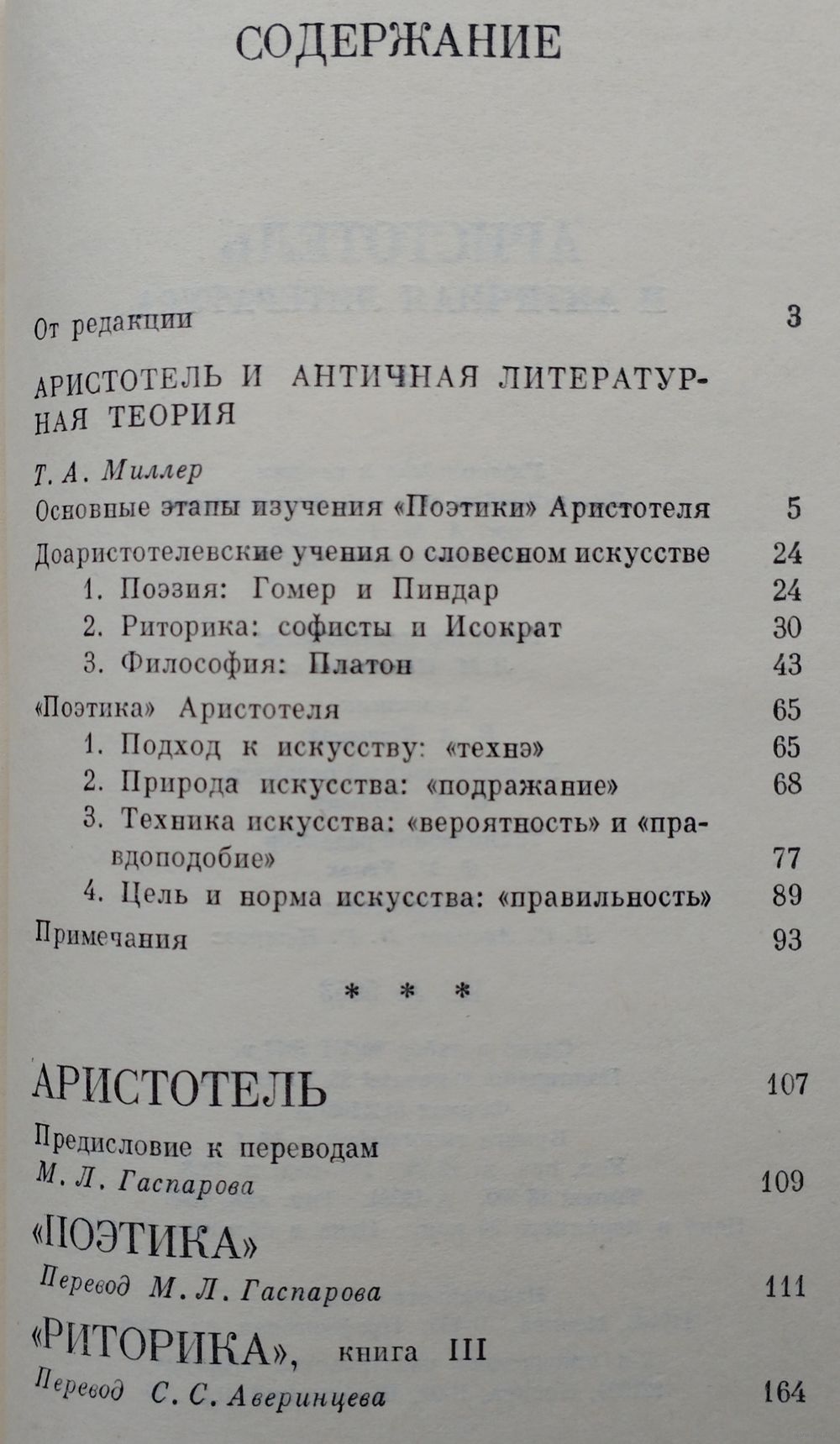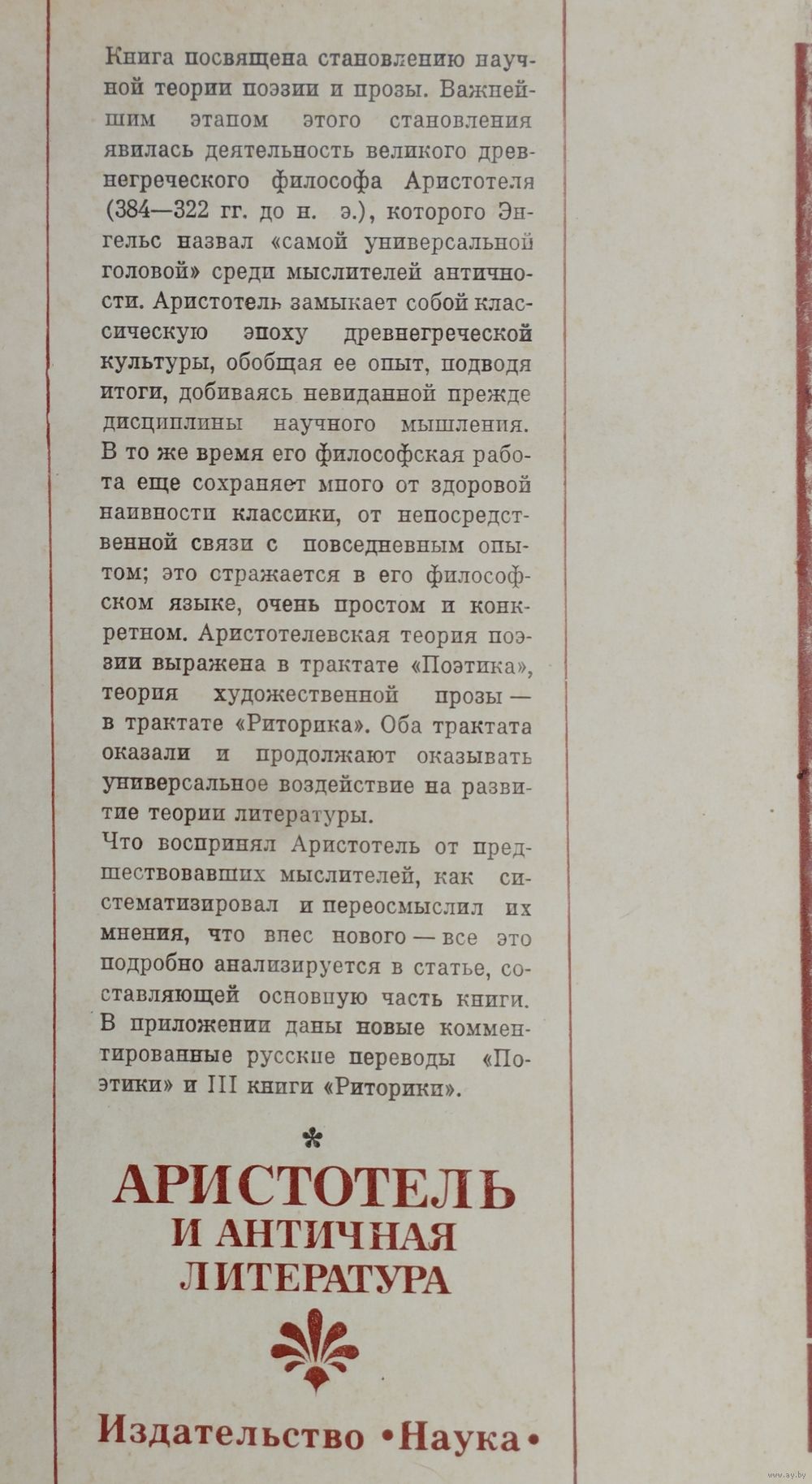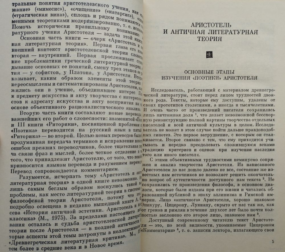 Тираж 18500 экз. 234 стр. Настоящая книга ставит своей задачей правильное понимание литературного учения Аристотеля. Основная часть книги - очерк "Аристотель и античная литературная теория". Первая глава намечает внешний контекст аристотелевской теории словесности, вторая - внутренний. Первая прослеживает становление проблематики греческой литературной теории, складывание ее основных понятий, смену трех этапов ее развития - у софистов, у Платона, у Аристотеля. Вторая показывает, каким образом элементы этой теории были переосмыслены и систематизированы Аристотелем. Вторую часть книги составляют новые переводы двух важнейших его работ: знаменитой "Поэтики" и III книги "Риторики", посвященной проблеме стиля. Книга посвящена становлению научной теории поэзии и прозы. Важнейшим этапом этого становления явилась деятельность великого древнегреческого философа Аристотеля (384—322 гг. до н. э.), которого Энгельс назвал «самой универсальной головой» среди мыслителей античности. Аристотель замыкает собой классическую эпоху древнегреческой культуры, обобщая ее опыт, подводя итоги, добиваясь невиданной прежде дисциплины научного мышления. В то же время его философская работа еще сохраняет много от здоровой наивности классики, от непосредственной связи с повседневным опытом; это отражается в его философском языке, очень простом и конкретном. Аристотелевская теория поэзии выражена в трактате «Поэтика», теория художественной прозы — в трактате «Риторика». Оба трактата оказали и продолжают оказывать универсальное воздействие на развитие теории литературы. Что воспринял Аристотель от предшествовавших мыслителей, как систематизировал и переосмыслил их мнения, что внес нового — все это подробно анализируется в статье, составляющей основную часть книги. В приложении даны новые комментированные русские переводы «Поэтики» и III книги «Риторики».