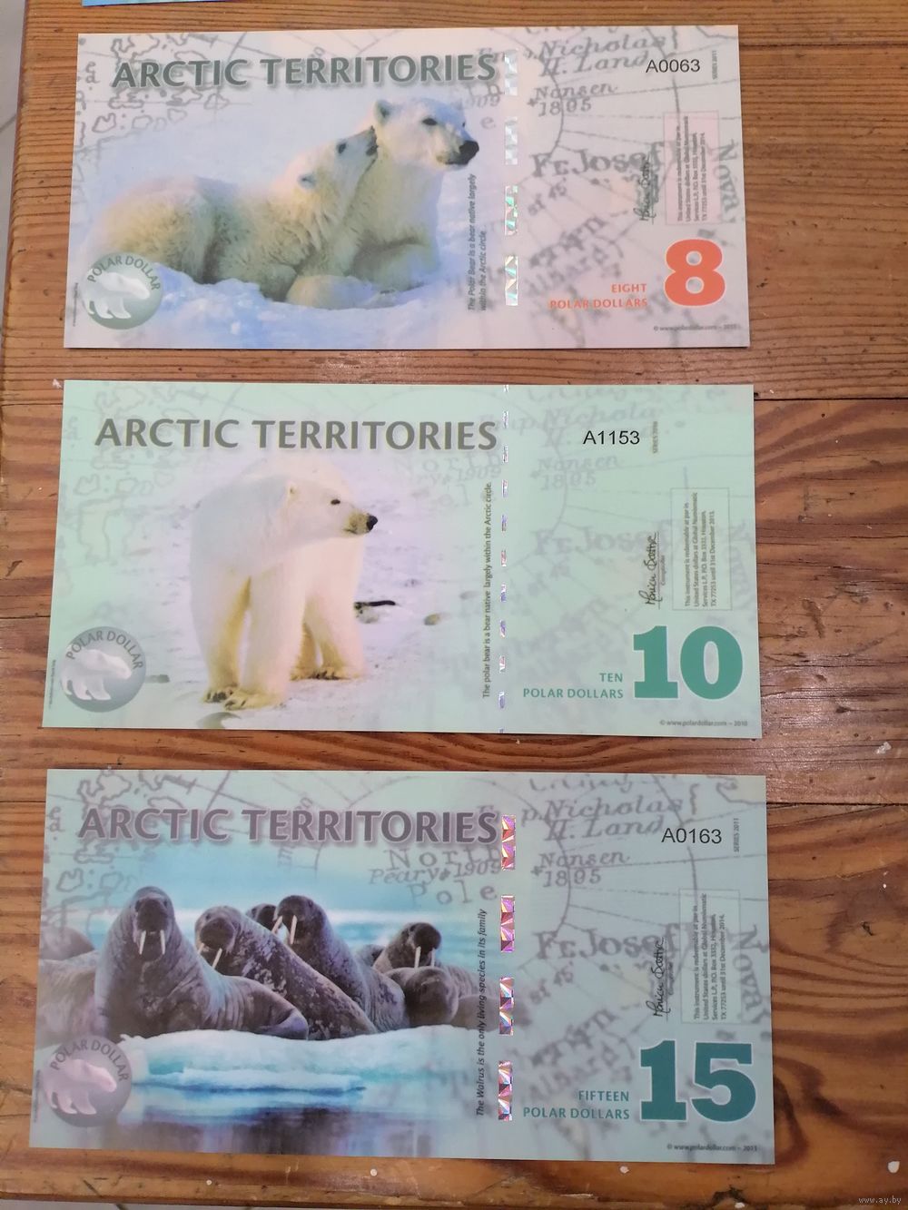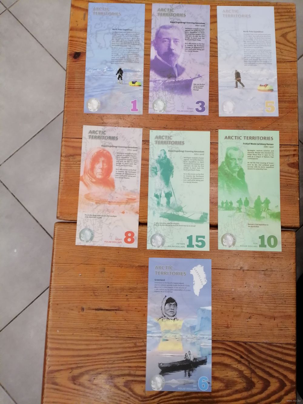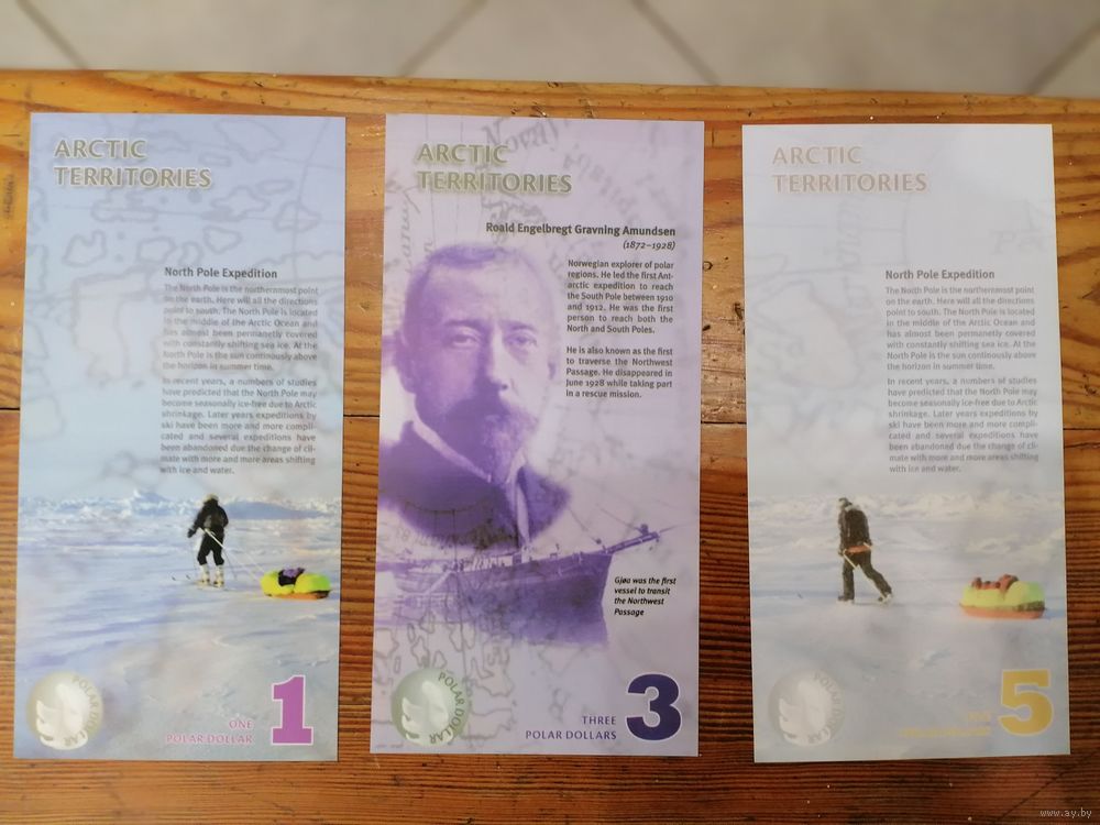 Банкноты "Арктические территории" номиналом 1, 3, 5, 6, 8, 1, 15 полярных долларов