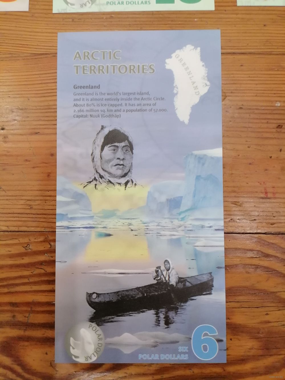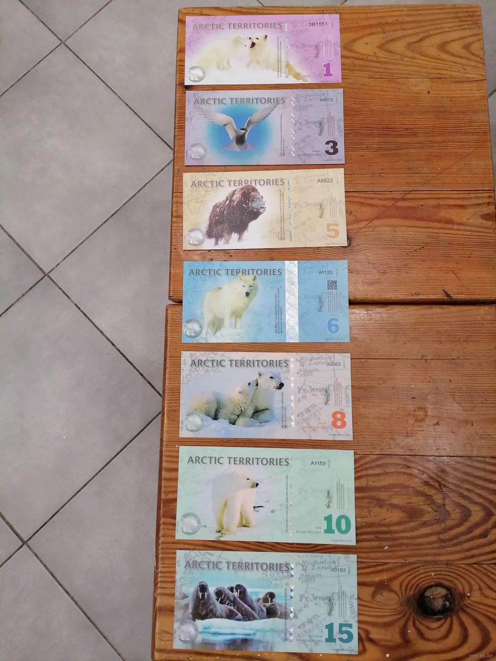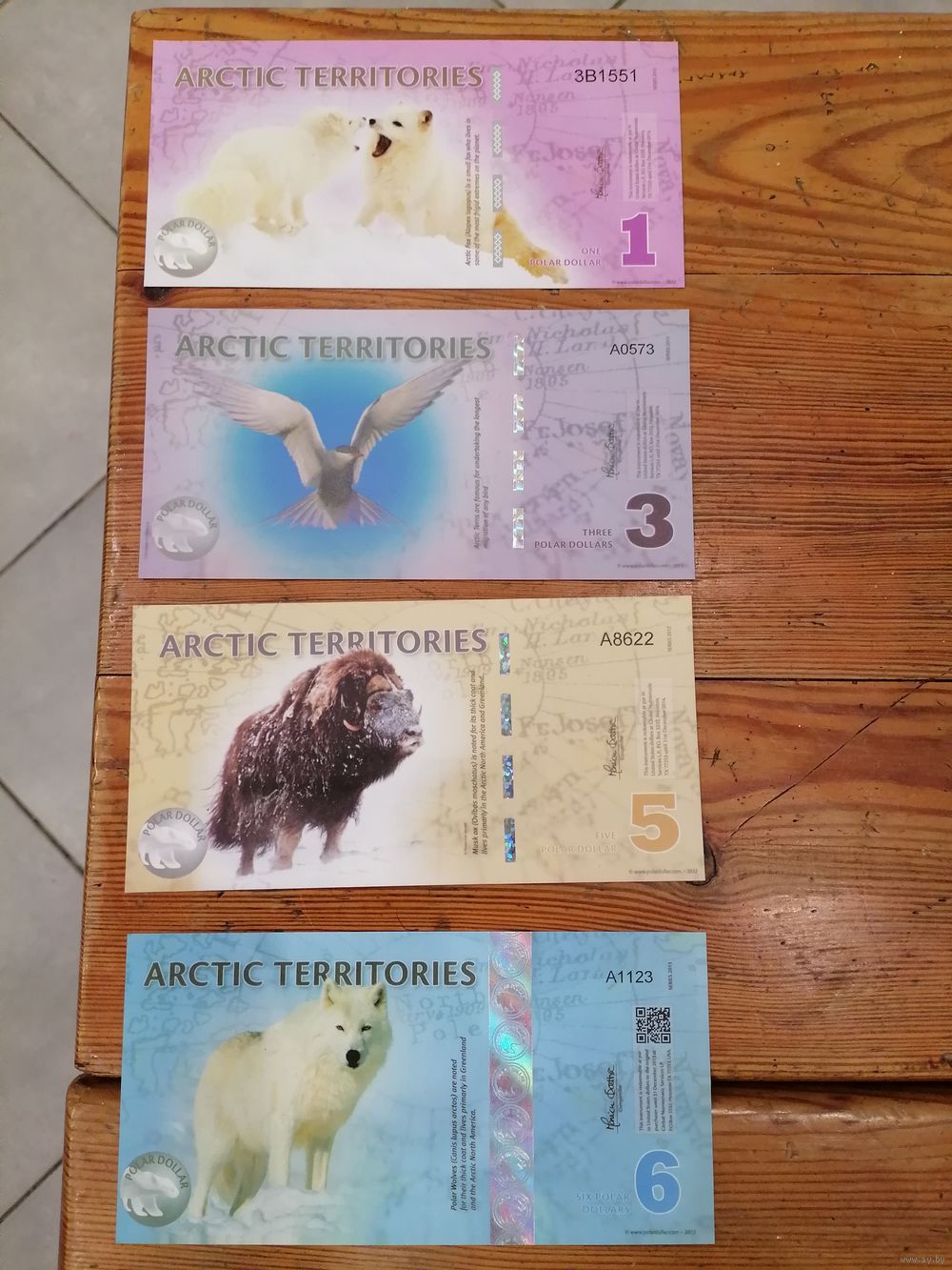 Банкноты "Арктические территории" номиналом 1, 3, 5, 6, 8, 1, 15 полярных долларов