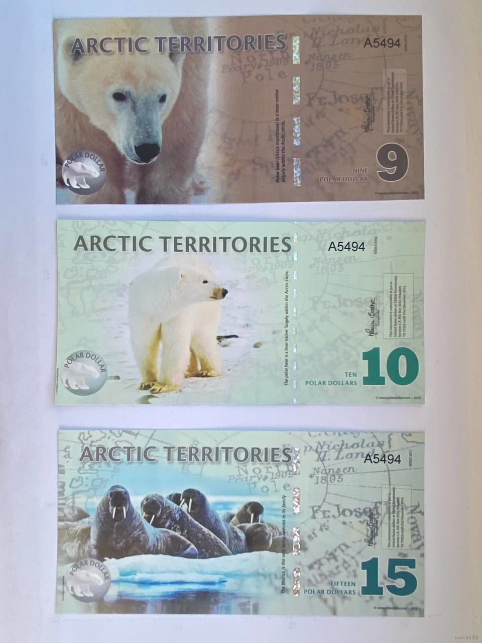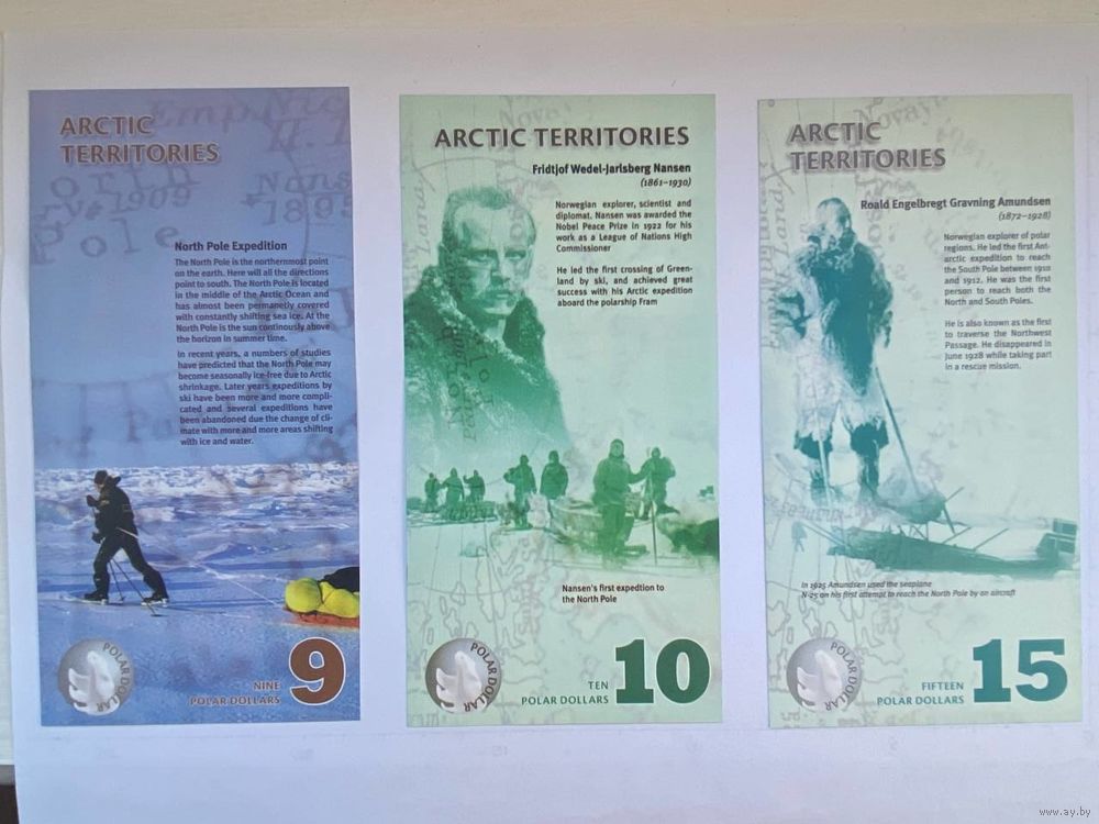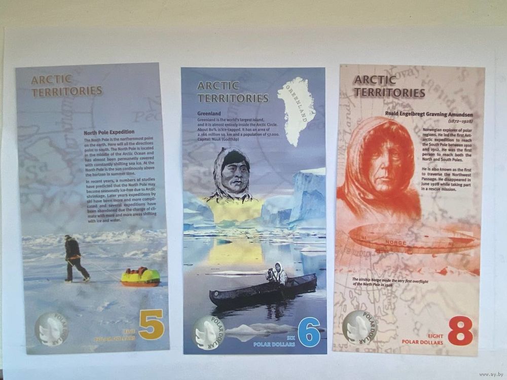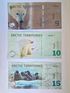 Серия - "Арктические территории" из 14 бон. Неофициальная денежная единица – доллар. Эти банкноты выпущены специально для коллекционеров бон. На лицевой и оборотной сторонах банкнот изображены различные представители фауны и рассказана история освоения Антарктики. Эти "коллекционные" деньги выполнены из пластика.