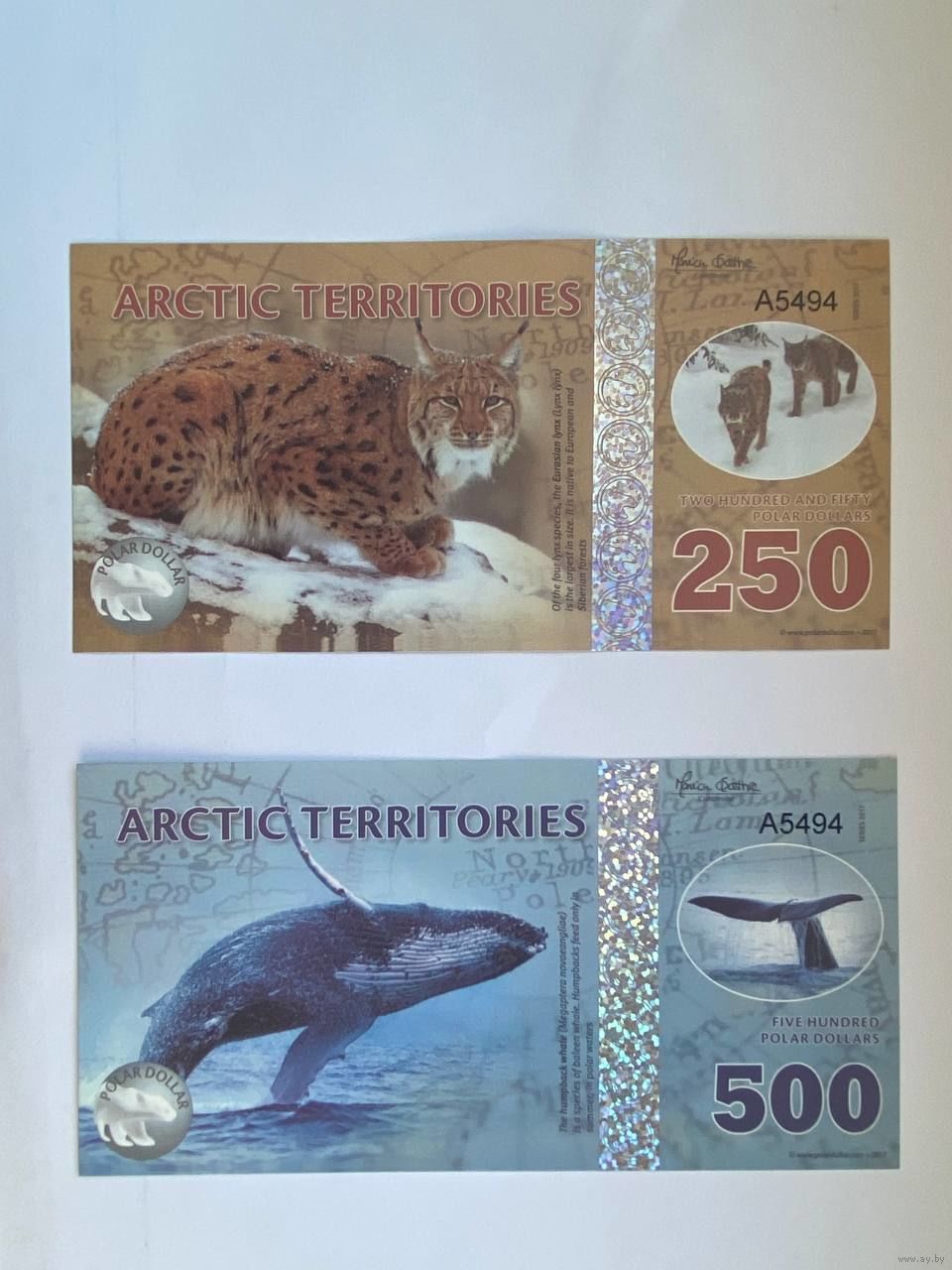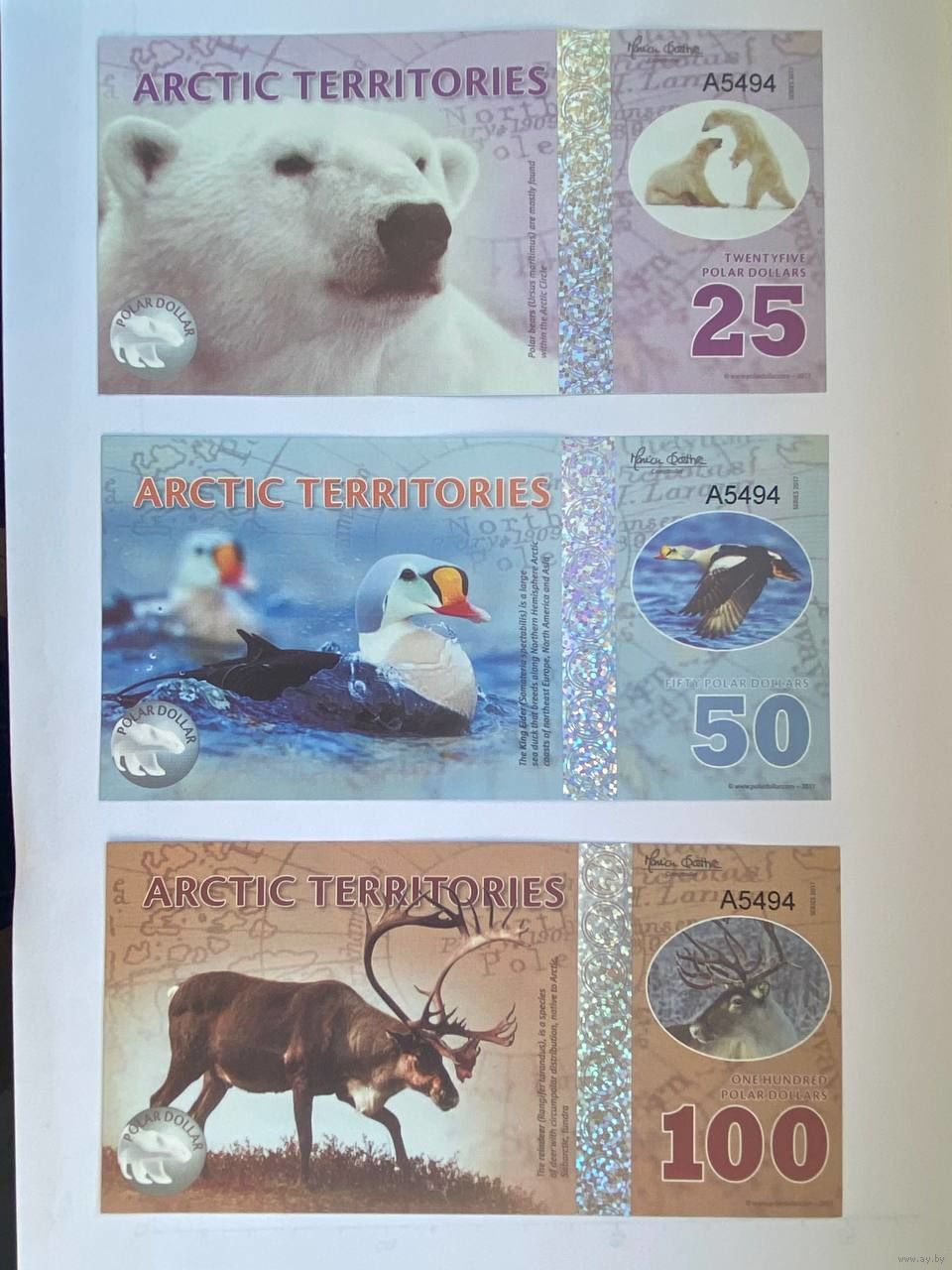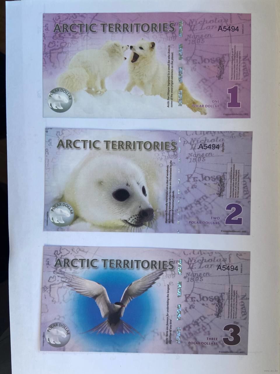 Серия - "Арктические территории" из 14 бон. Неофициальная денежная единица – доллар. Эти банкноты выпущены специально для коллекционеров бон. На лицевой и оборотной сторонах банкнот изображены различные представители фауны и рассказана история освоения Антарктики. Эти "коллекционные" деньги выполнены из пластика.