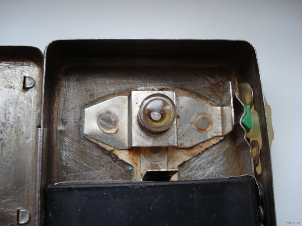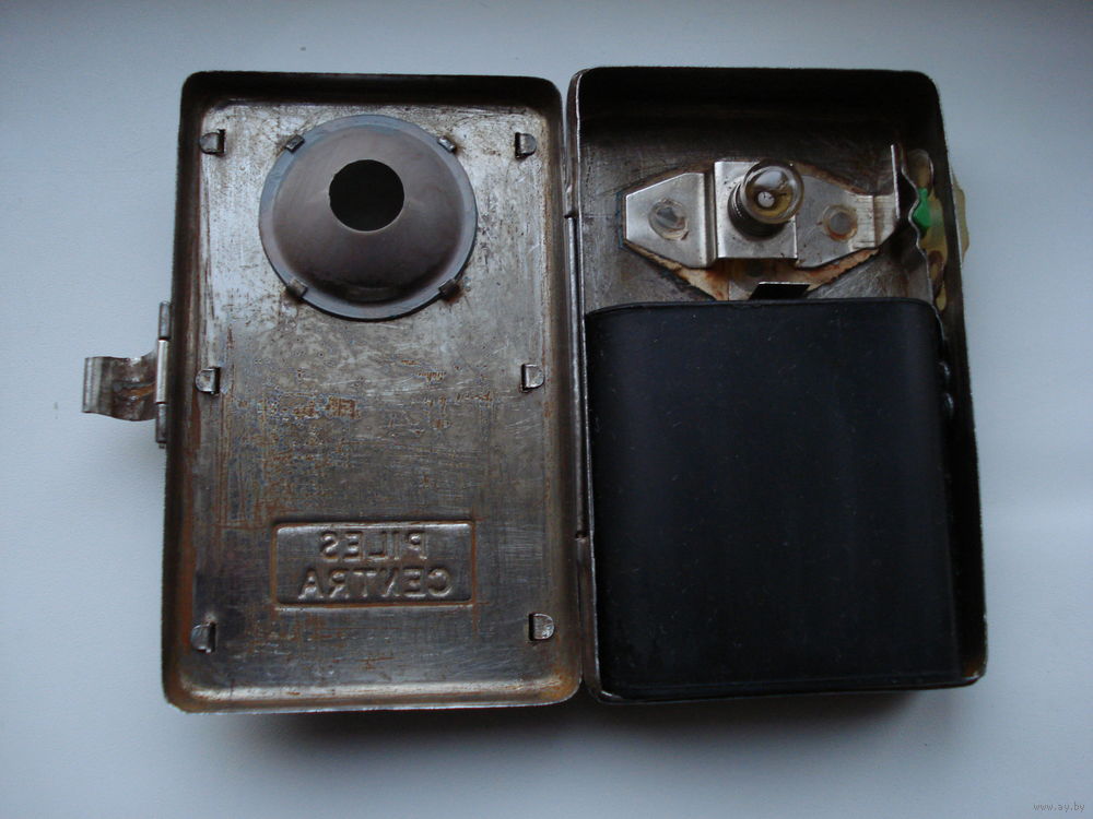 Стальной корпус. Размеры фонарика: В(Д) 110 мм х Ш 67 мм х Т 35 мм . Конструктивно предусмотрены светофильтры, зеленый и красный. Светит белым, красным и зелёным светом. Также конструктивной особенностью этого фонарика является то, что помимо кнопки включения и выключения фонарика, ещё есть встроенная кнопка-прерыватель, которая служит для передачи светосигналов на расстояние. Питание - элемент 3R12 (он же плоская квадратная батарейка), в комплект продажи не входит !!! На внутренней стороне открывающейся крышки фонарика можно увидеть штампованное зеркально расположенное клеймо "PILES CENTRA". Можно предположить, что данная модель фонарика изготавливалась старыми штампами или собиралась из оставшихся деталей раннее выпускавшихся фонариков другой модели...