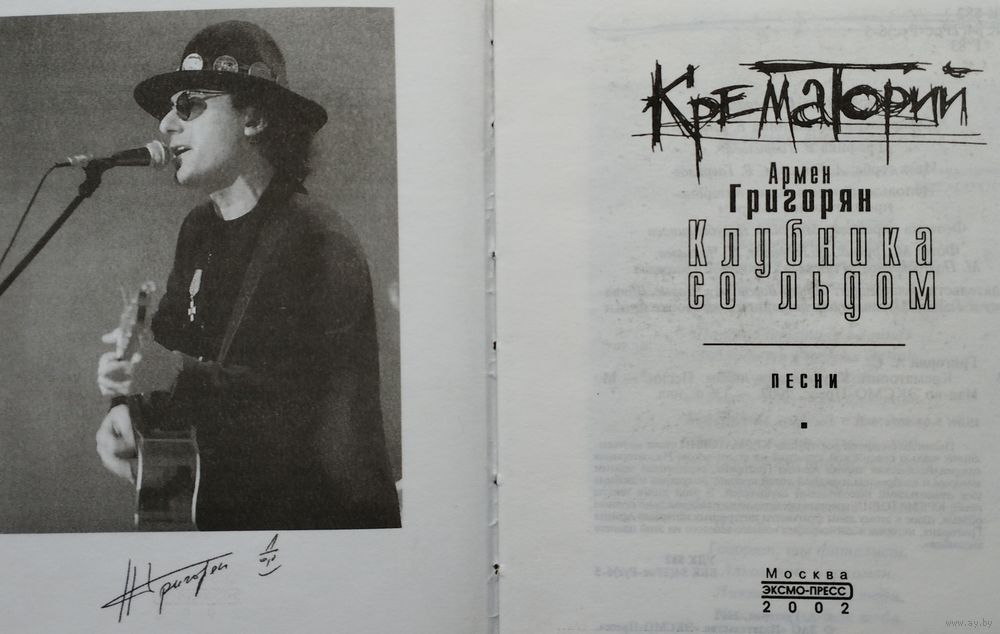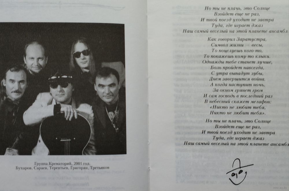Тираж 6100 экз. 338 стр. Песни легендарной рок-группы КРЕМАТОРИЙ стали неотъемлемой частью российской культуры на стыке веков. Неповторимая сюрреалистическая лирика Григоряна, скрашенная черным юмором и сдобренная изрядной долей иронии, популярна и любима уже несколькими поколениями слушателей. В этой книге тексты песен КРЕМАТОРИЯ впервые представлены в максимально полном объеме, плюс к этому даны фрагменты интересных интервью Армена Григоряна, история и дискография "самого веселого на этой планете ансамбля".
