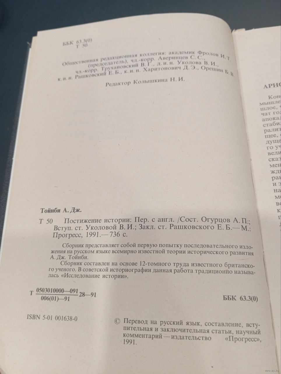 Книга Арнольда Тойнби "Постижение истории" — первое на русском языке изложение всемирно известной теории исторического развития британского ученого . Это сборник, составленный на основе фундаментального 12-томного труда "Исследование истории" (A Study of History), писавшегося с 1934 по 1961 год . Издание 1991 года, издательство "Прогресс" (Москва).