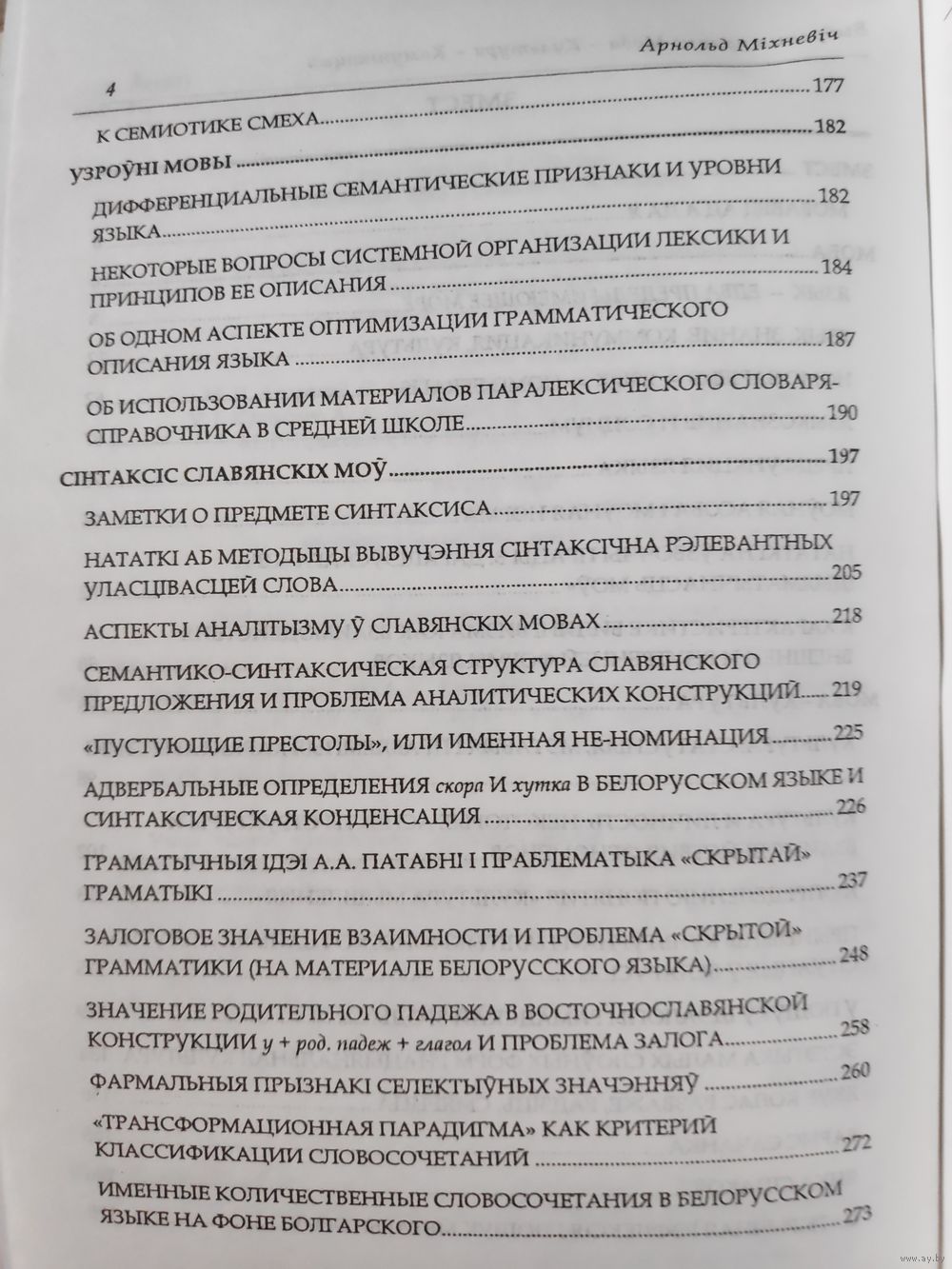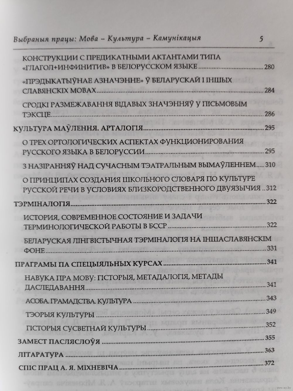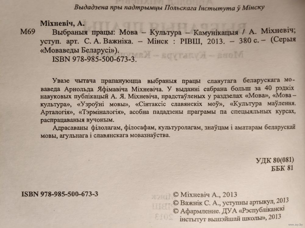 Увазе чытача прапануюцца выбраныя працы славутага беларускага мо- ваведа Арнольда Яфімавіча Міхневіча. У выданні сабрана больш за 40 рэдкіх навуковых публікацый А. Я. Міхневіча, прадстаўленых у раздзелах «Мова», «Мова - культура», «Узроўні мовы», «Сінтаксіс славянскіх моў», «Культура маўлення. Арталогія», «Тэрміналогія», асобна пададзены праграмы па спецыяльных курсах, распрацаваныя вучоным.