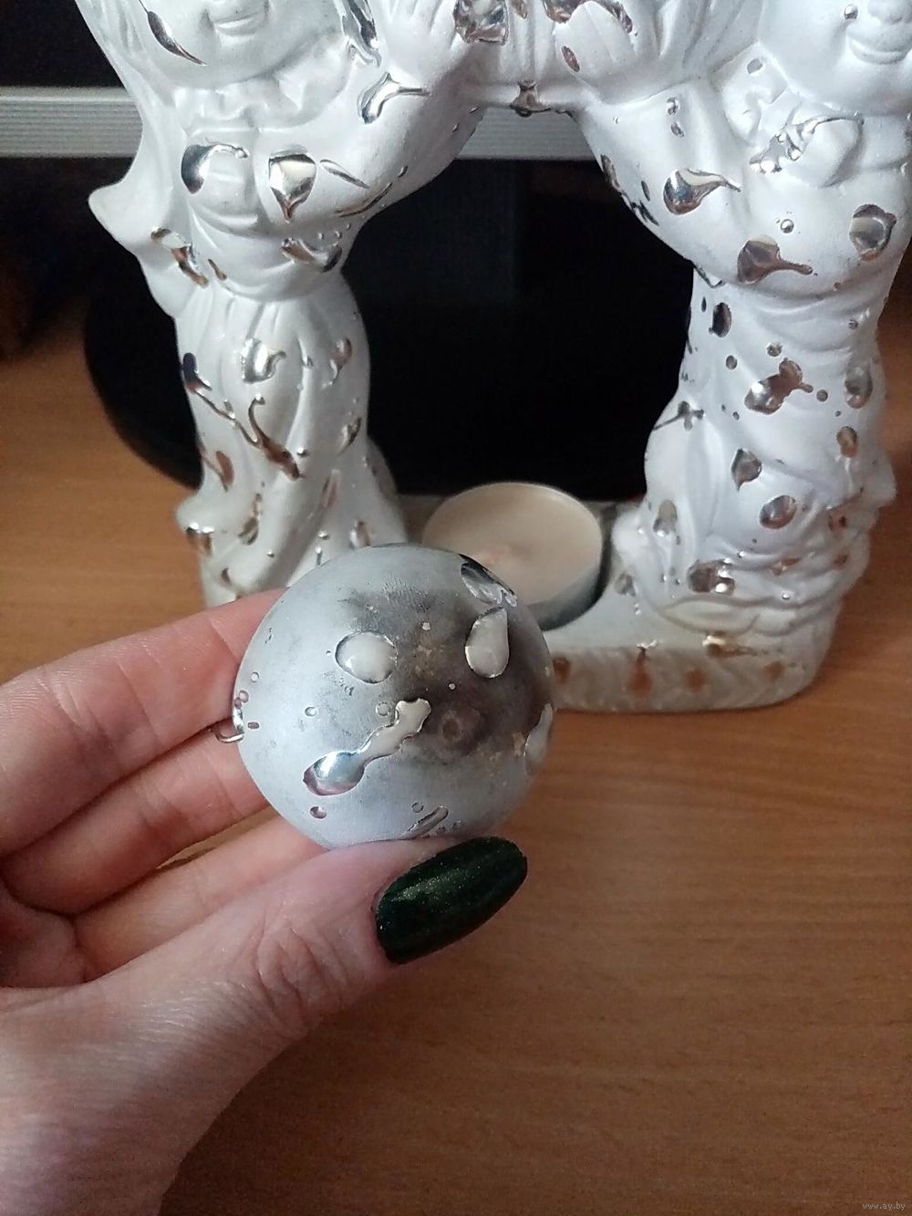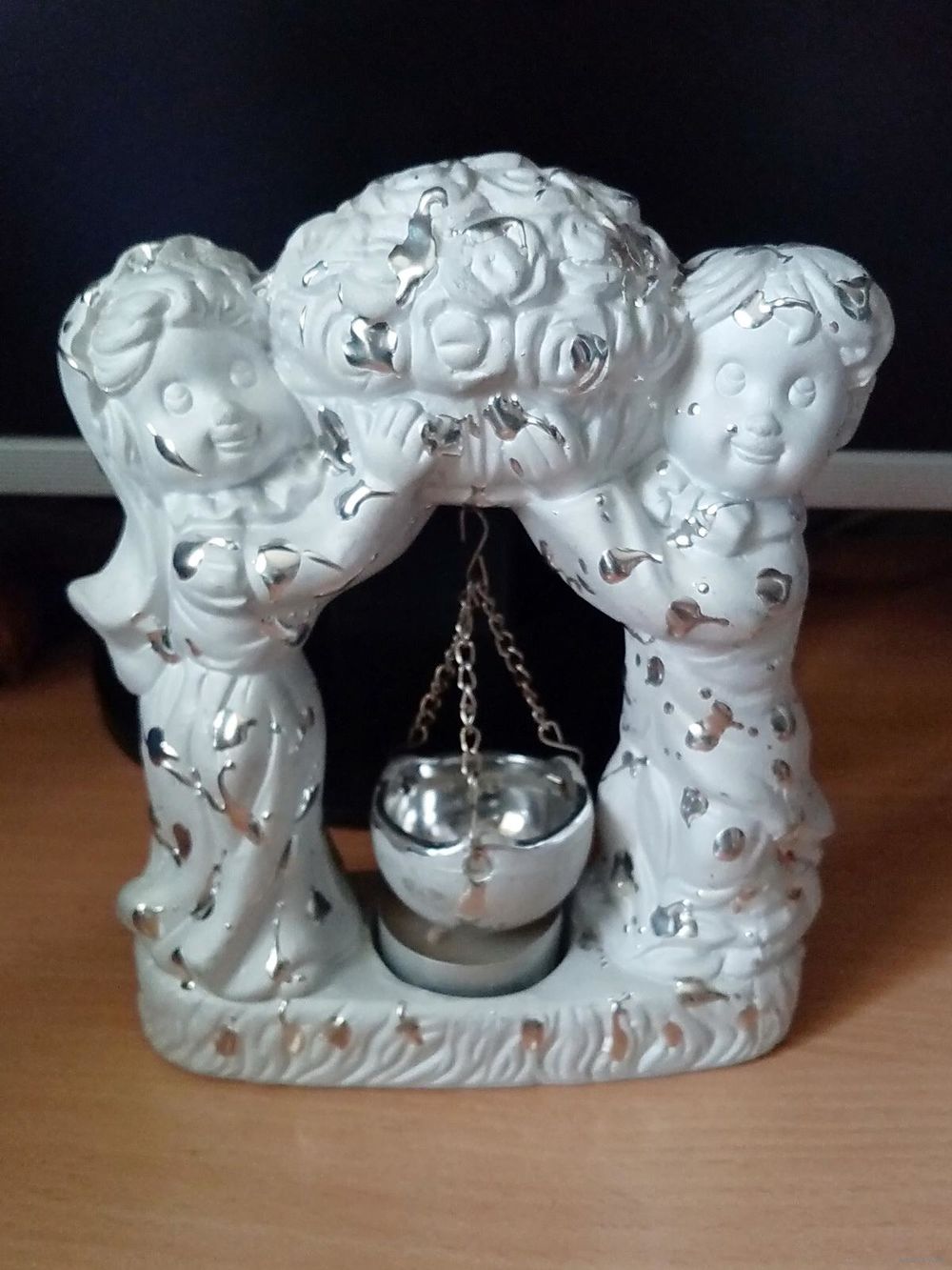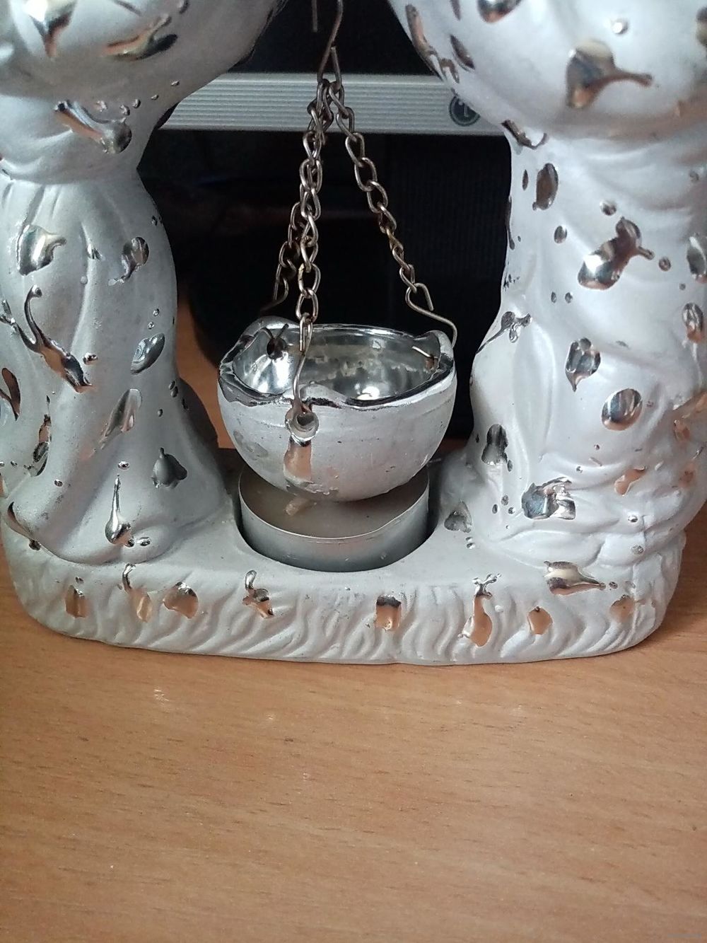 | на фото, керамика. Если использовать как аромалампу - желательно укоротить цепочки чашечки, а если как подсвечник - вообще её снять. | |