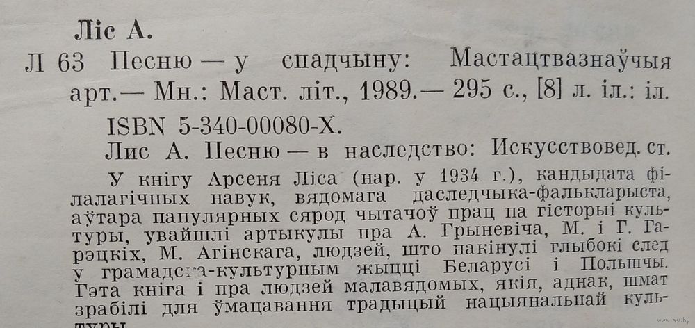 Арсень Ліс. Песню - у спадчыну: мастацтвазнаўчыя артыкулы. Мінск : Мастацкая літаратура, 1989 г. 293 с. Цверды пераплет. Супервокладка.
