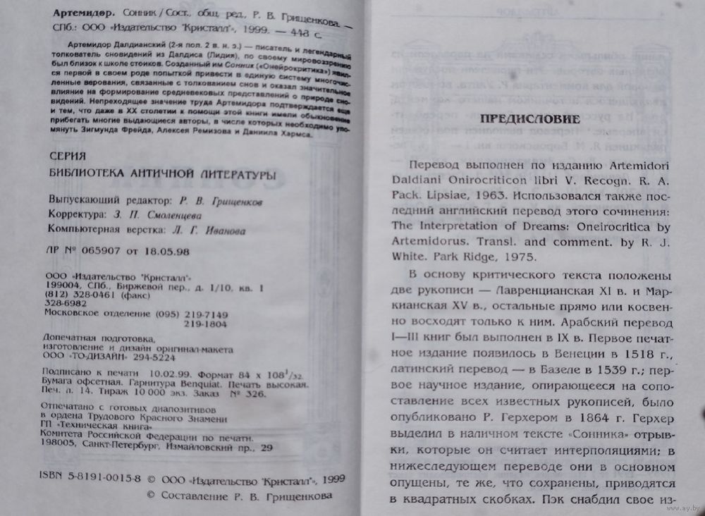 448 стр. Артемидор Далдианский (2 - я пол. 2 в. н. э.) - писатель и легендарный толкователь сновидений из Далдиса (Лидия), по своему мировоззрению был близок к школе стоиков. Созданный им Сонник (`Онейрокритика`) явился первой в своем роде попыткой привести в единую систему многочисленные верования, связанные с толкованием снов и оказал значительное влияние на формирование средневековых представлений о природе сновидений. Непреходящее значение труда Артемидора подтверждается еще и тем, что даже в XX столетии к помощи этой книги имели обыкновение прибегать многие выдающиеся авторы, в числе которых необходимо упомянуть Зигмунда Фрейда, Алексея Ремизова и Даниила Хармса.