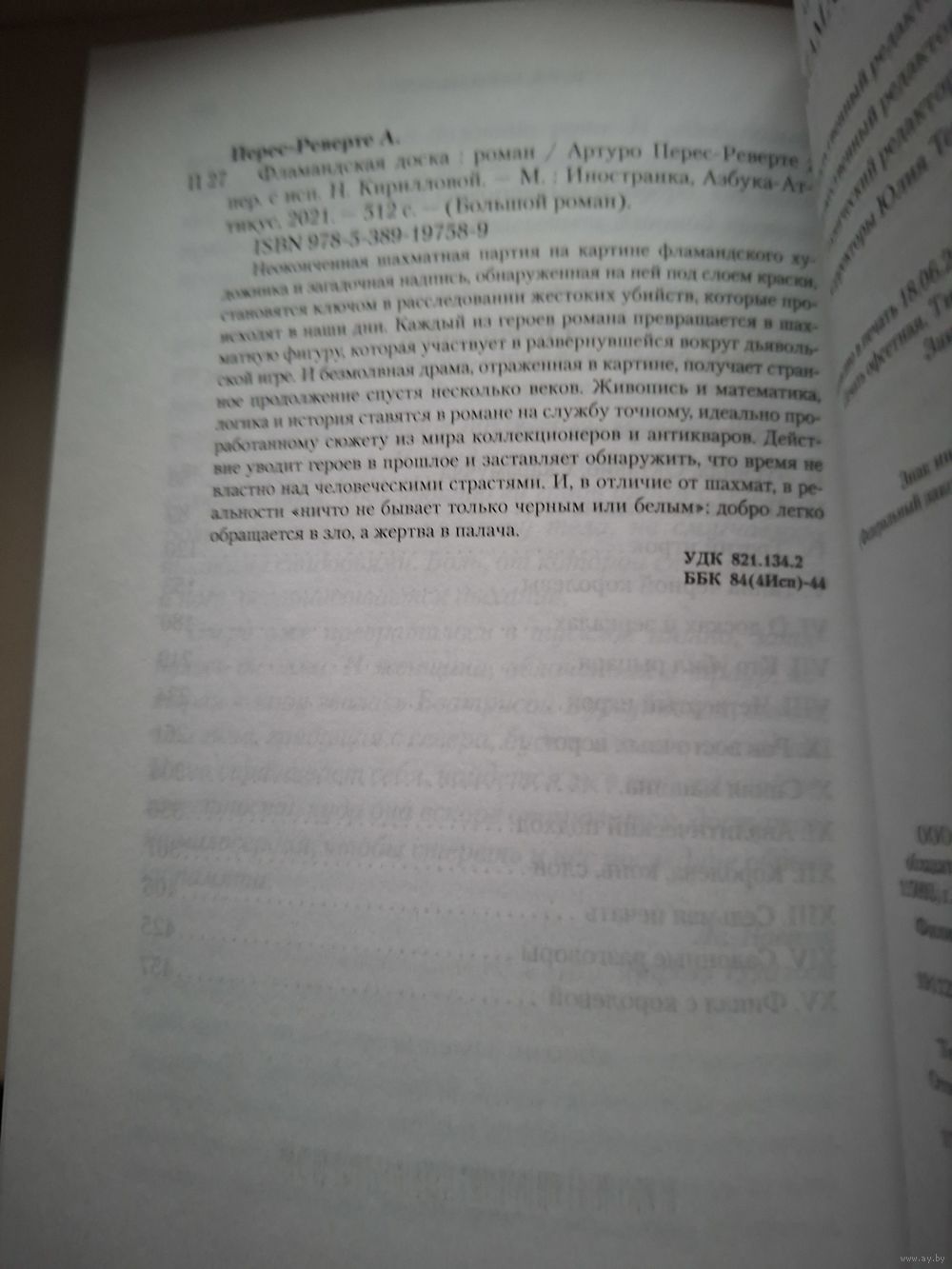 Парадоксальный и многоликовый, завораживающий перемещением действия из одного временного и культурного пласта в другой, с головокружительно закрученным сюжетом, роман открывает для читателя мир антикваров, в котором старинная картина является ключом к разгадке жестоких преступлений, происходящих в наши дни, и за каждую проигранную фигуру в шахматной партии заплачено человеческой жизнью...