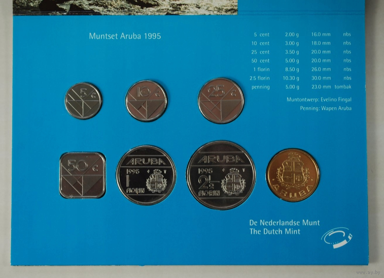 Аруба годовой набор 5+10+25+50 центов 1+2,5 гульдена + жетон 1995 год, UNC.