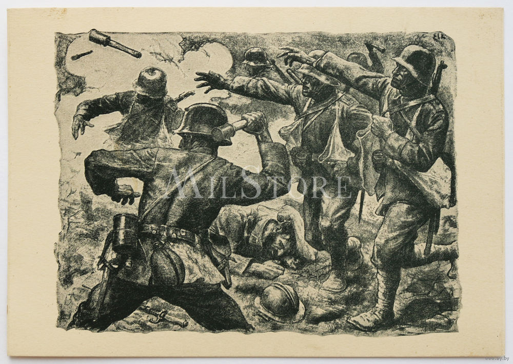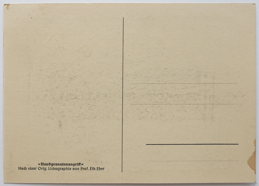 Немецкая открытка выполненная на основе литографии художника Элька (Эмиля) Эбера. Эта открытка входила в серию из 6 открыток под названием "Фронтовые картины 1918". Выпускалась в 1930-х годах в Германии. Размер 10,4см. х 14,8 см.