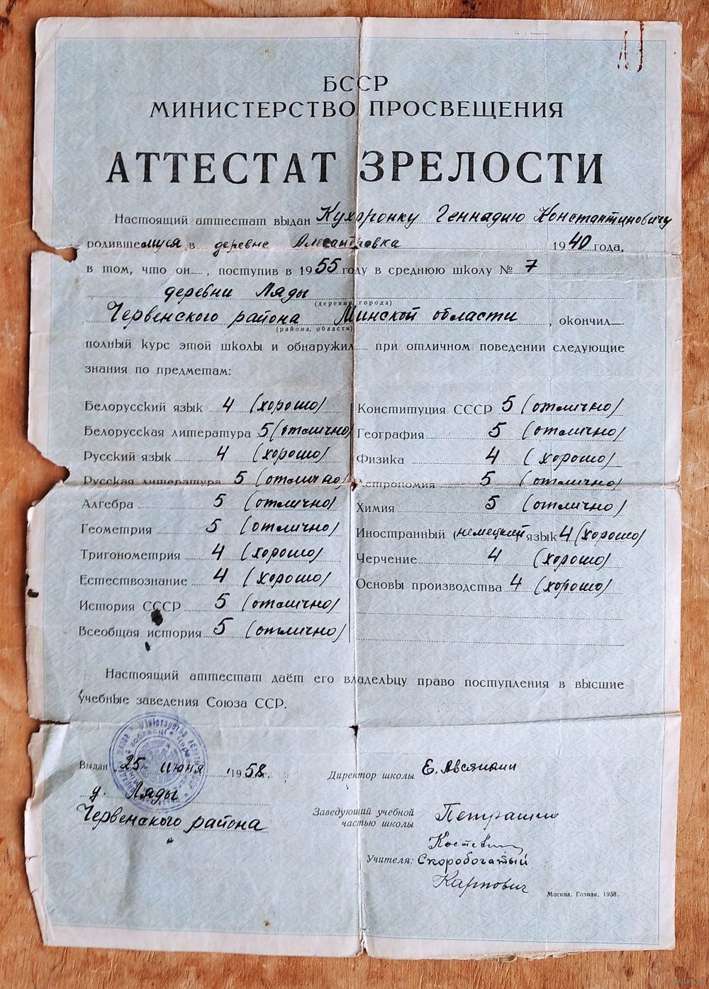 Атэстат сталасці (Аттестат зрелости). Ляды. Чэрвеньскі раен. 1958 г.