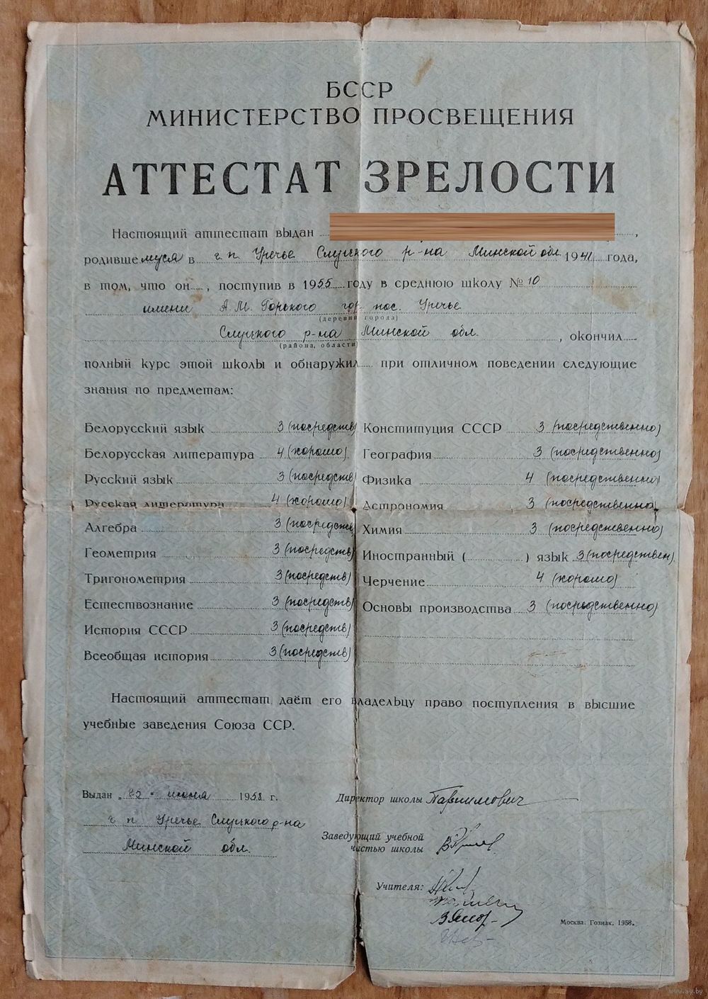 Атэстат сталасці (Аттестат зрелости). Слуцкі раён. 1955 г.