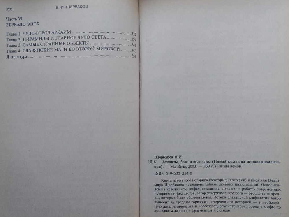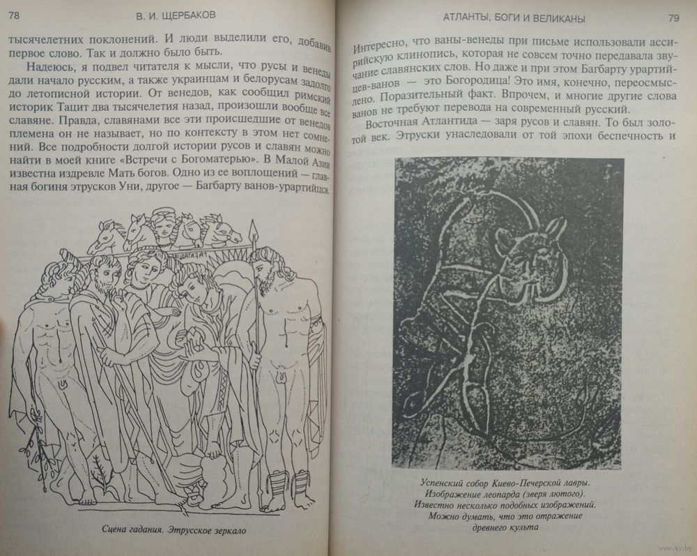 Большой формат. Тираж 7000 экз. 360 стр. Книга известного историка (доктора философии) и писателя Владимира Щербакова посвящена тайнам древних цивилизаций. Основываясь на источниках, мифах, сказаниях, а также на работах современных историков и филологов, автор утверждает, что боги - это далекие предки, которые были обожествлены. Истоки славянской мифологии автор выносит за пределы горизонта, очерченного историей, - в необозримую даль тысячелетий и воссоздает, реконструирует русские мифы по дошедшим до нас фрагментам и сказкам.
