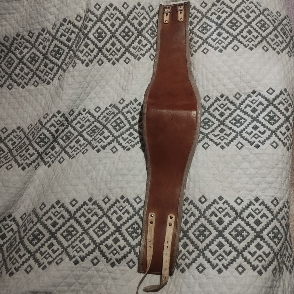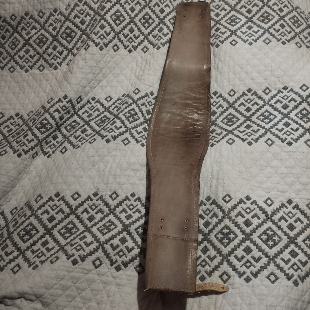 Атлетический или тяжелоатлетический пояс, предназначенный для поддержки спины во время поднятия тяжестей. .Длина 93 см без учета ремней, ширина по спине 18 см, по животу 10,5 см. Целый. (ссср). Надпись "3 380".