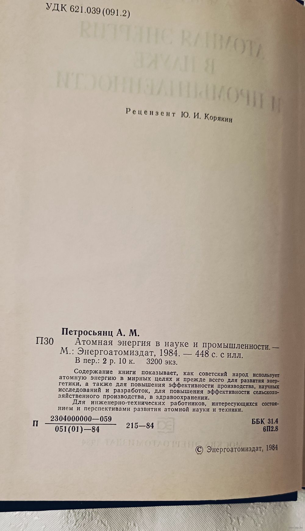 Петросьянц А. М. Атомная энергия в науке и промышленности.-М.: Энергоатомиздат, 1984. 448 с. с илл., твёрдый переплёт, чуть увеличенный формат.