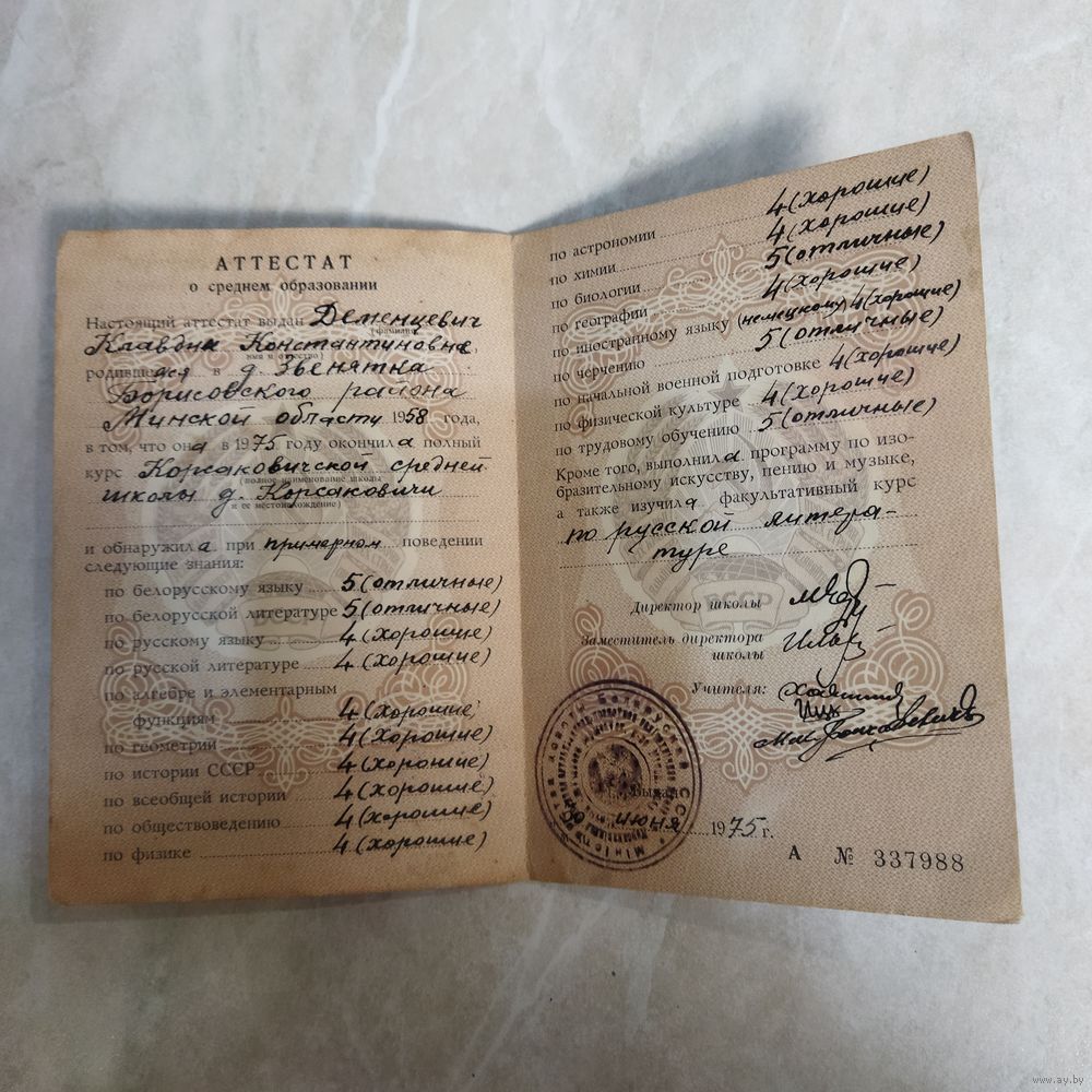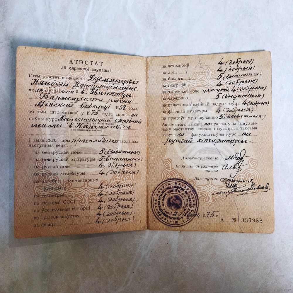 Аттестат о среднем образовании. БССР. Школа д. Корсаковичи, Борисовского района. 1975 год.
