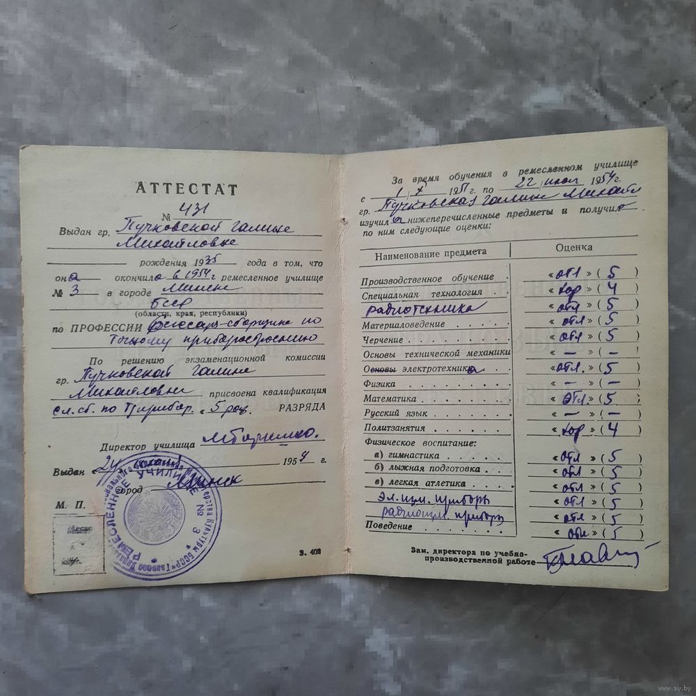 Аттестат об окончании ремесленного училища 1957г
