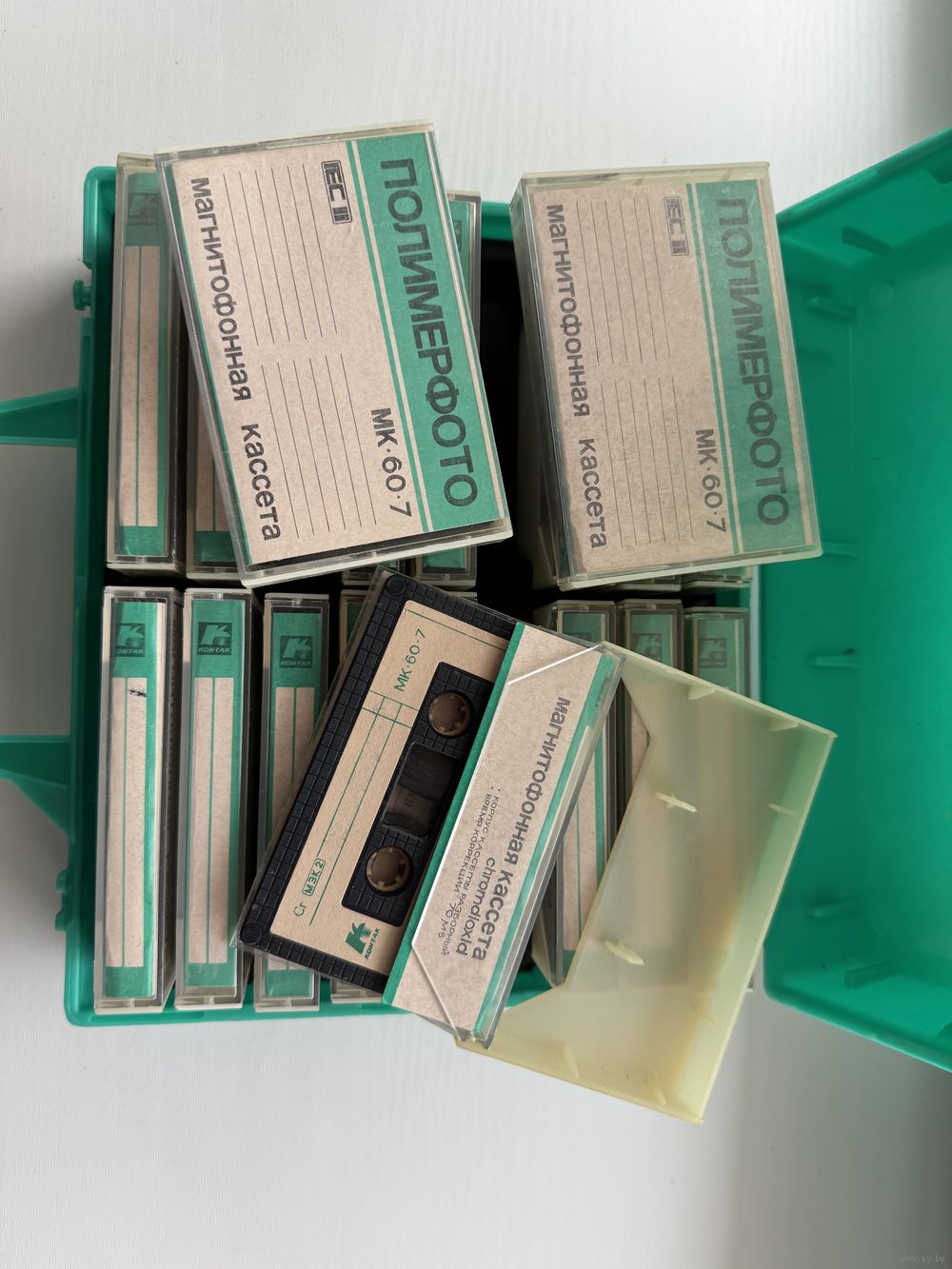 В двух кейсах (36 шт.) находятся кассеты производства завода Полимерфото, г.Казань. Данные кассеты выпущены в СССР и являются редкими. Корпус разборный, пленка хром производства Dessaner Magnetband GmbH (Германия).