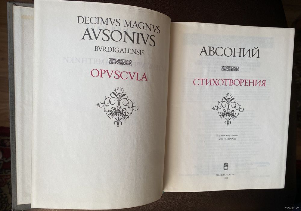 Содержание: Посвящение императору Феодосию Августу. Домашние стихи. Круглый день. О родных. О преподователях Бурдигалы. Книга Эколог. Действо семи мудрецов. О двенадцати цезарях. Эпитафии героям,павшим в Троянской войне. Придворные стихи. О знаменитых городах. Мозелла. О Биссуле. Распятый купидон. Гриф о числе три. Технопегнии. Свадебный центон. Благодарственная речь к императору Грациану. Послание. Эпиграммы.