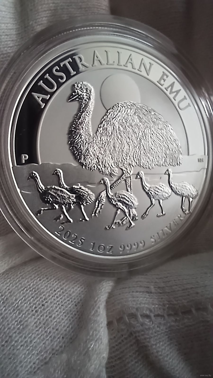 Австралийский эму — крупная нелетающая птица, которая может преодолевать большие расстояния. Хотя у эму есть перья, они не могут летать, потому что их крылья слишком малы. Эму встречаются по всей Австралии почти во всех типах среды обитания и питаются в основном травой, цветами, семенами и насекомыми. Эму — вторая по величине из ныне живущих птиц после страуса. Пертский монетный двор выпустил серию золотых и серебряных золотых монет с изображением этого уникального животного. Выпуск 2025 года — восьмой выпуск этой серии.