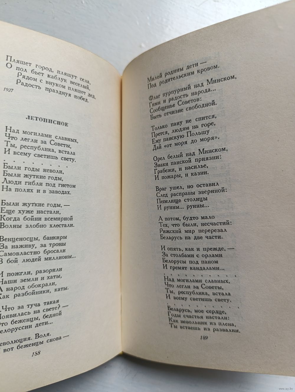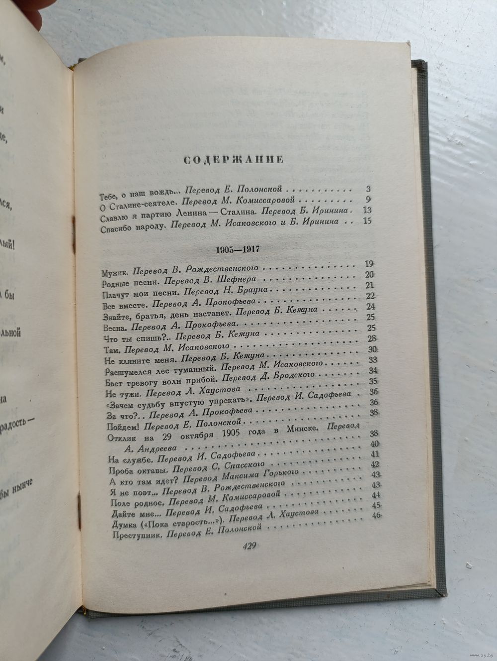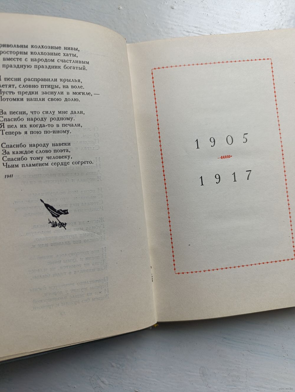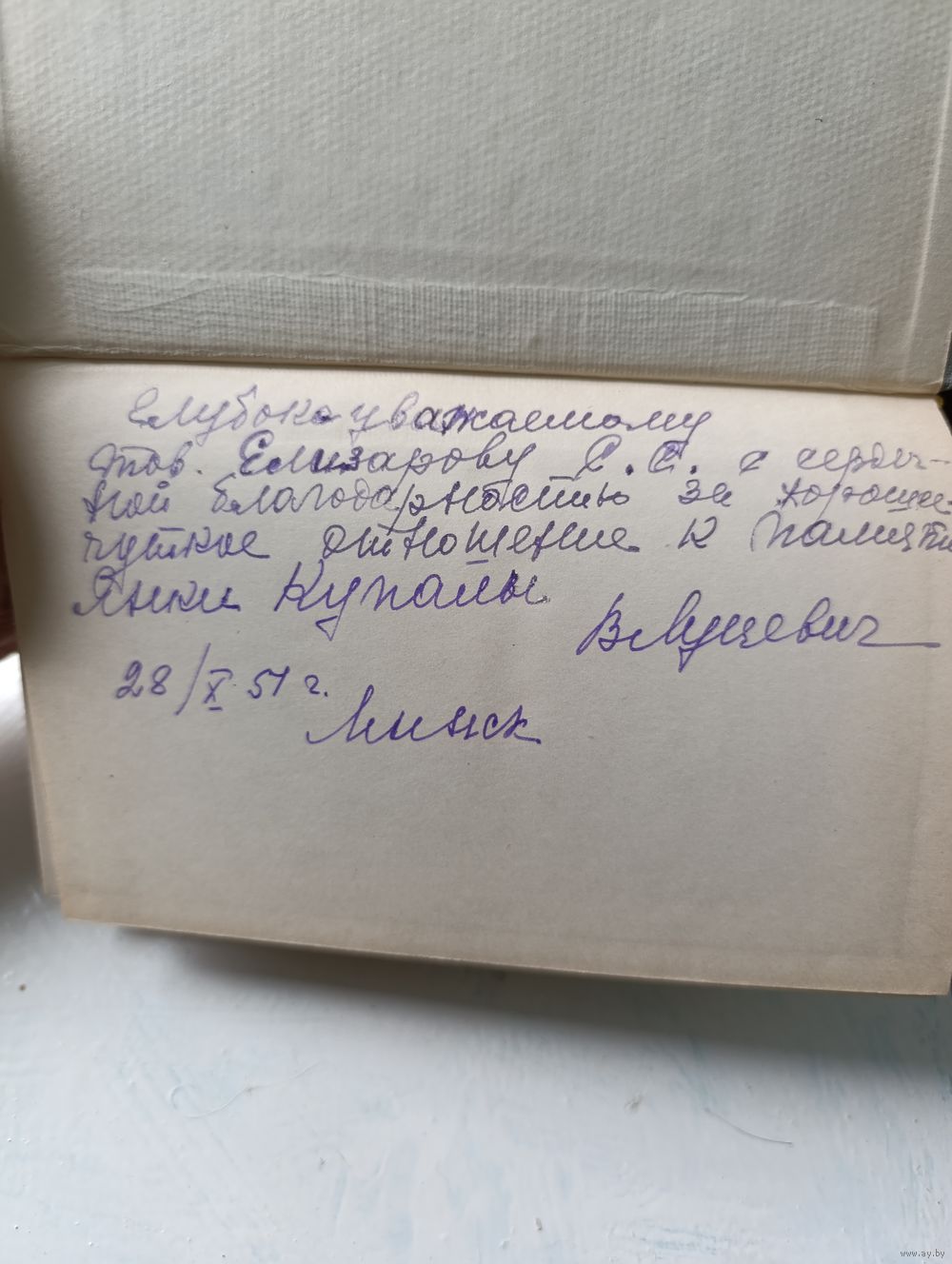 Редкая книга (небольшой тираж - всего 10 000 экземпляров) стихов Янки Купалы на русском языке 1950 года издания. Содержит в себе большое количество произведений об советской власти, вождях коммунистической партии. На форзаце дарственная надпись с подписью вдовы поэта, первого директора его мемориального музея Владиславы Луцевич