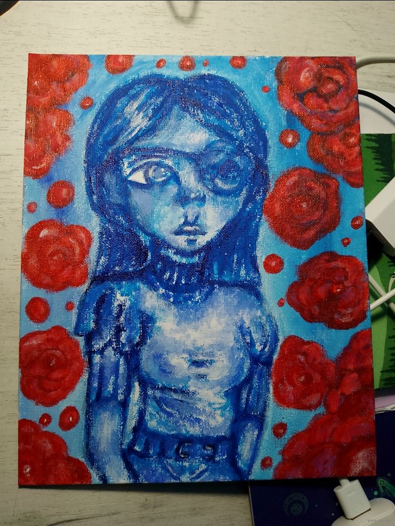 Собственноручно нарисованная картина акрилом с изображением девушки, отражающей силу в её красоте и женственности. Она показывает, что девушка тоже может быть сильной.