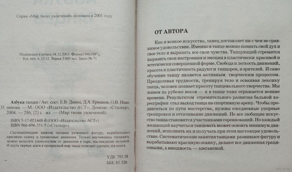 Тираж 5000 экз. 288 стр. “Систематические занятия танцами развивают фигуру, вырабатывают красивую осанку и грациозные движения. Только научившись танцевать, Можно испытать удовольствие от движения в паре, наслаждение музыкой. И пусть первые шаги в прекрасный мир танца поможет сделать эта книга.”
