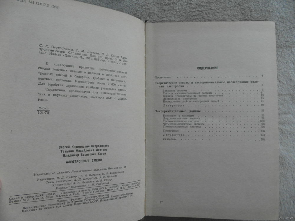 В справочнике приведена систематизированная сводка опытных данных о наличии и свойствах азеотропных смесей в бинарных, тройных и многокомпонентных системах. Рассмотрено более 21000 систем. Для удобства справочник снабжен указателем систем.