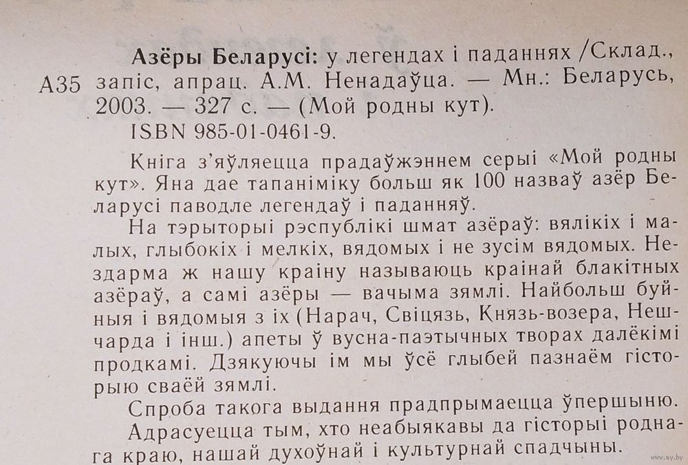 Азёры Беларусі ў легендах і паданнях. Складанне, запіс і апрацоўка А. М. Ненадаўца. (Мой родны кут). Мінск : Беларусь, 2003 г. 326 с. Мяккая вокладка.