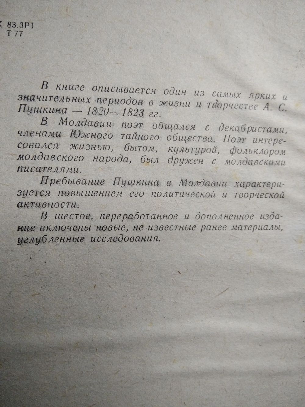 В книге описывается один из самых ярких и значительных периодов в жизни и творчестве А.С. Пушкина - 1820-1823 гг. В Молдавии поэт общался с декабристами, членами Южного тайного общества. Поэт интересовался жизнью, бытом, культурой, фольклором молдавского народа, был дружен с молдавскими писателями. Пребывание Пушкина в Молдавии характеризуется повышением его политической и творческой активности. В шестое, переработанное и дополненное издание включены новые, не известные ранее материалы, углубленные исследования.