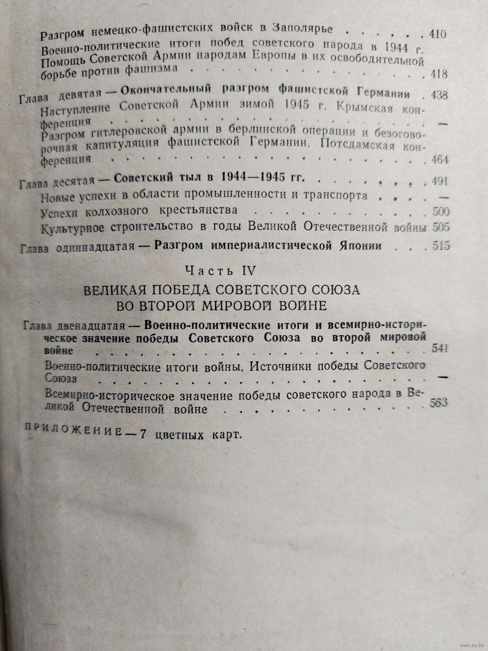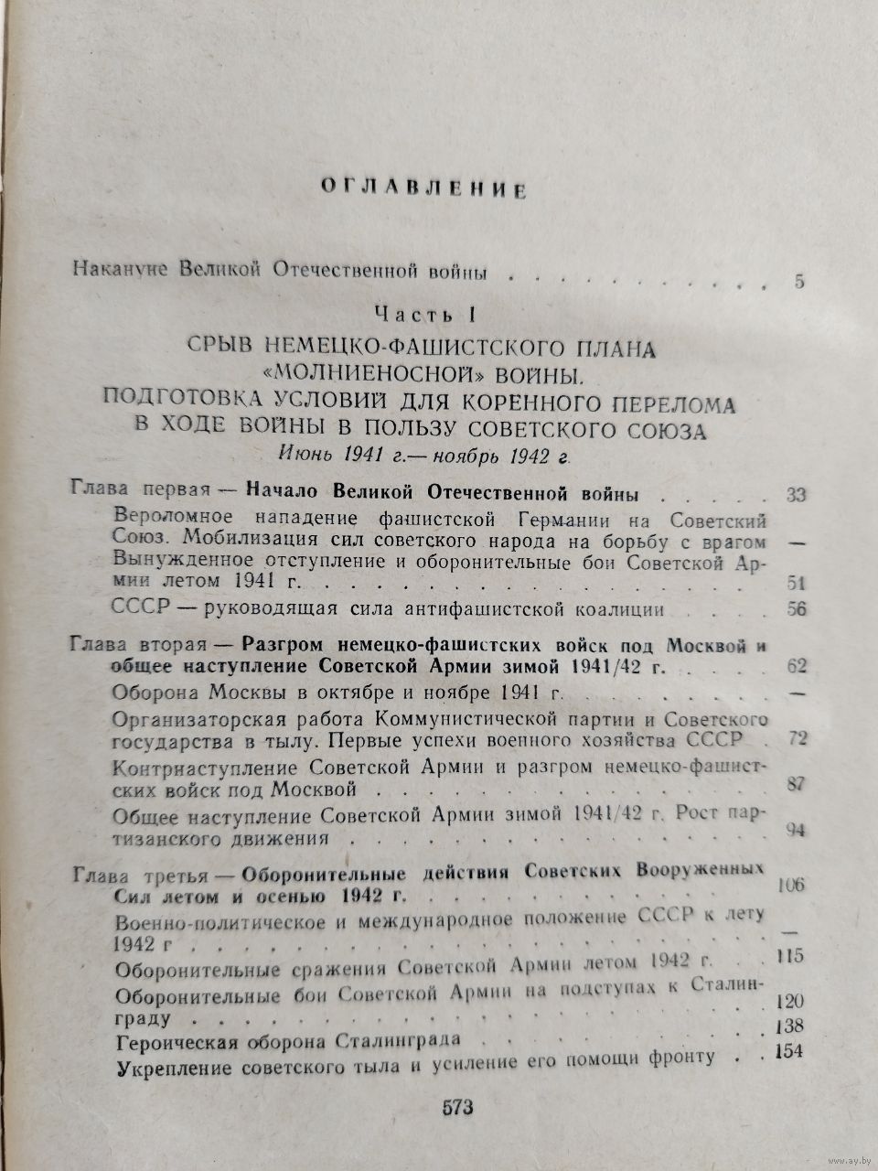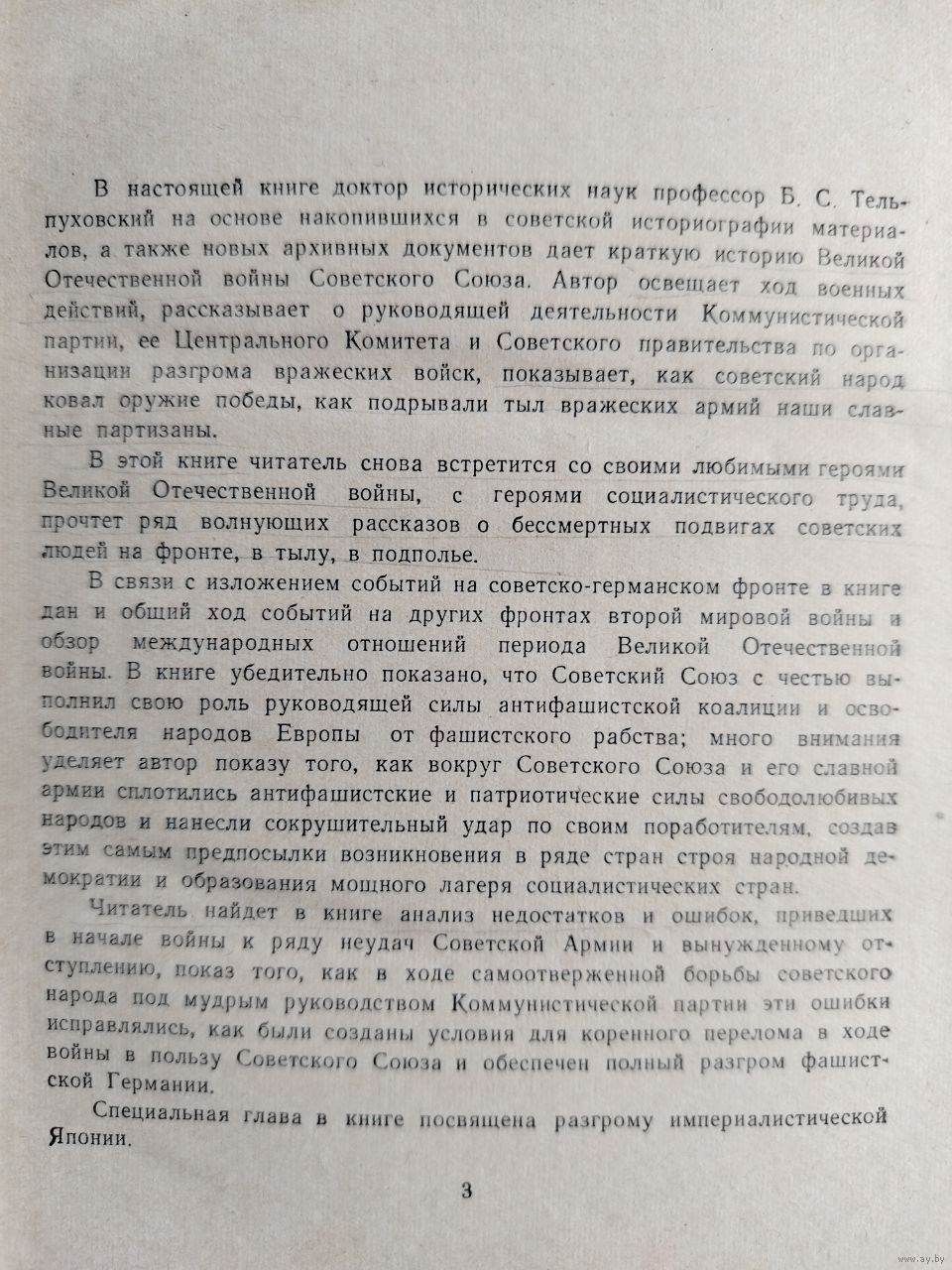 В книге Тельпуховский Б.С. на основе накопившихся советской историографии материалов, а также новых архивных документов дает краткую историю Великой Отечественной войны. Автор освещает ход военных действий, рассказывает о руководящей деятельности Компартии, ее Центрального Комитета и Советского правительства по организации разгрома вражеских войск, показывает, как советский народ ковал оружие победы, как подрывали тыл вражеских армий наши славные партизаны.