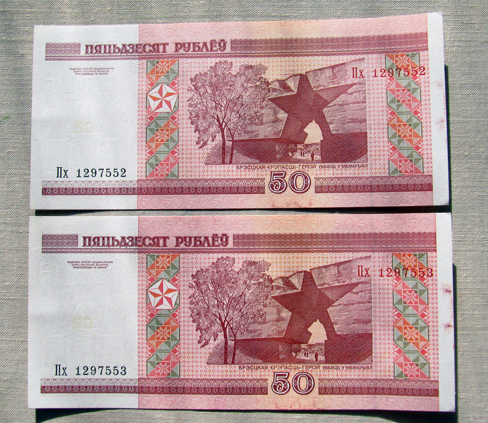 Б03-0466 50 Рублей Беларусь 2000 Серия Пх 2 купюры из одной пачки Номера подряд