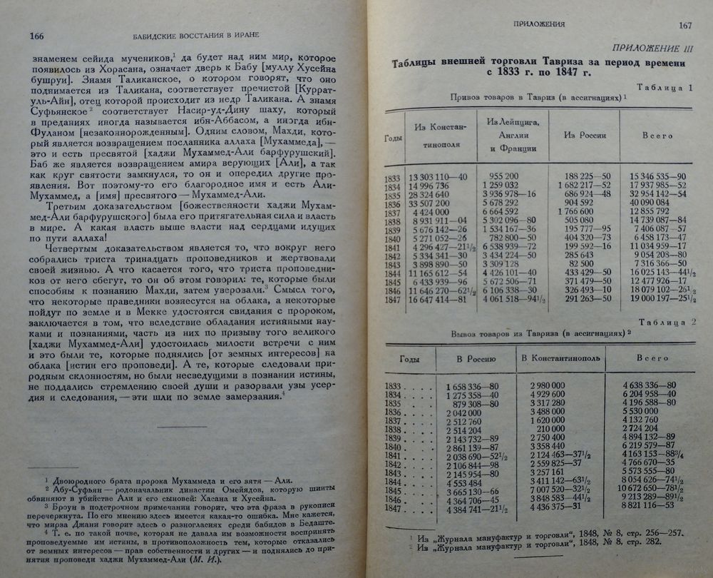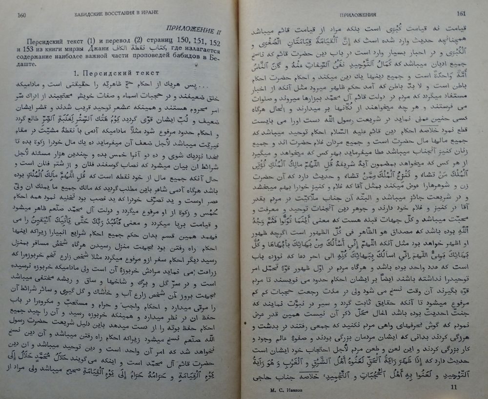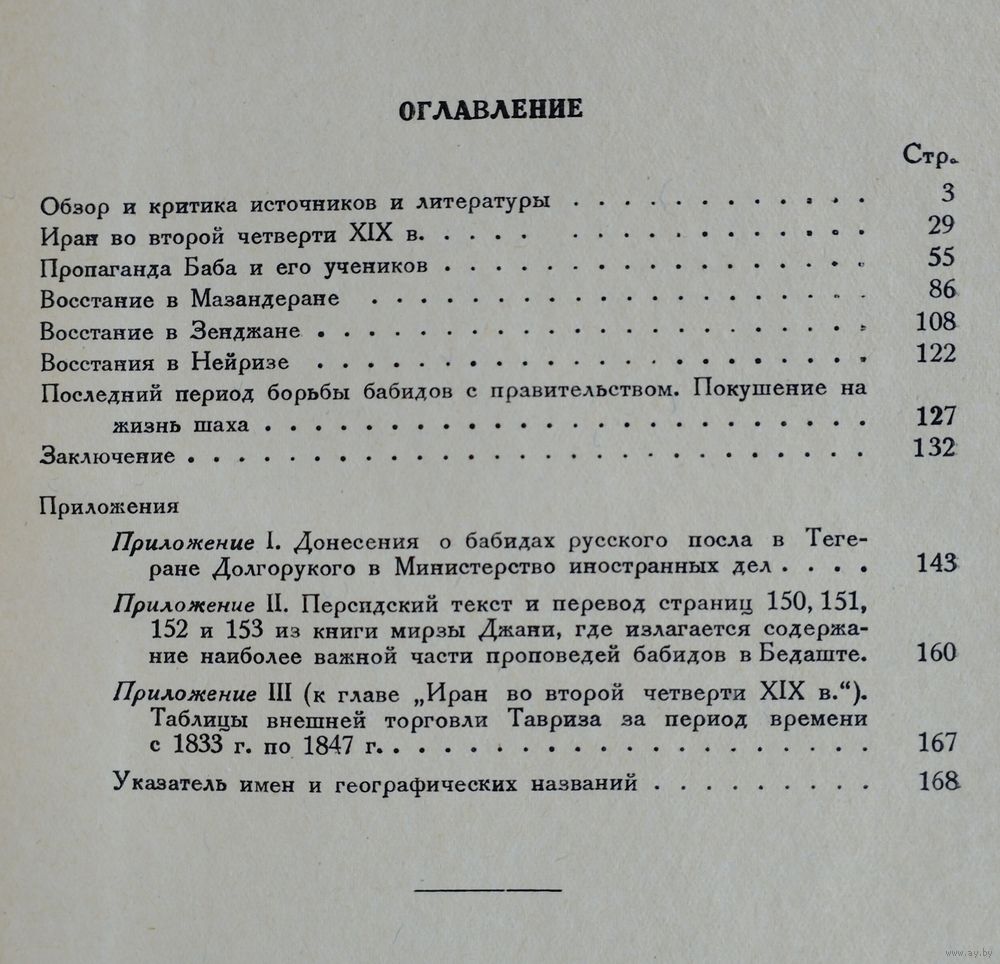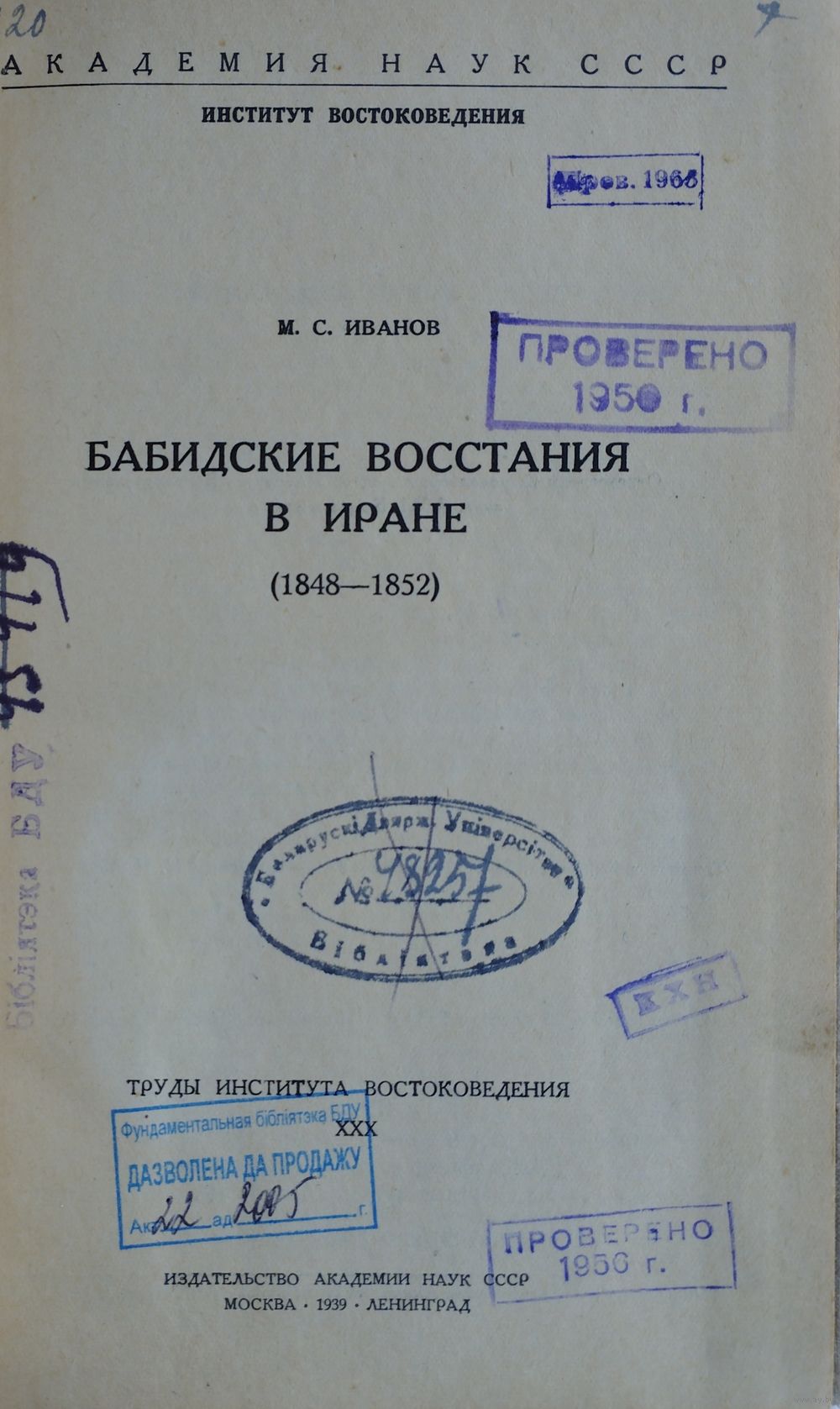Большой формат. Тираж 3000 экз. 178 стр. "Работа «Бабидские восстания в Иране (1848—1852)» является диссертацией на ученую степень кандидата исторических наук, которую я защитил в декабре месяце 1937 г. Написана она во время моего пребывания в аспирантуре исторического факультета Ленинградского государственного университета в 1935—1937 гг. Основными материалами для написания ее, за исключением главы первой, служили, главным образом, источники на персидском языке, причем значительная часть из них использована мною для исследования впервые. Считаю своим долгом принести глубокую благодарность проф. Е. Э. Бертельсу и проф. А. А. Ромаскевичу, к помощи и советам которых я обращался в работе над персидскими источниками; Е. А. Реферофской, проредактировавшей мой перевод с французского языка на русский документов из Архива внешней политики, а также всем сотрудникам Института востоковедения Академии Наук СССР, оказавшим мне в моей работе большую помощь своими замечаниями, советами и указаниями." (М. С. Иванов). Есть штампы.